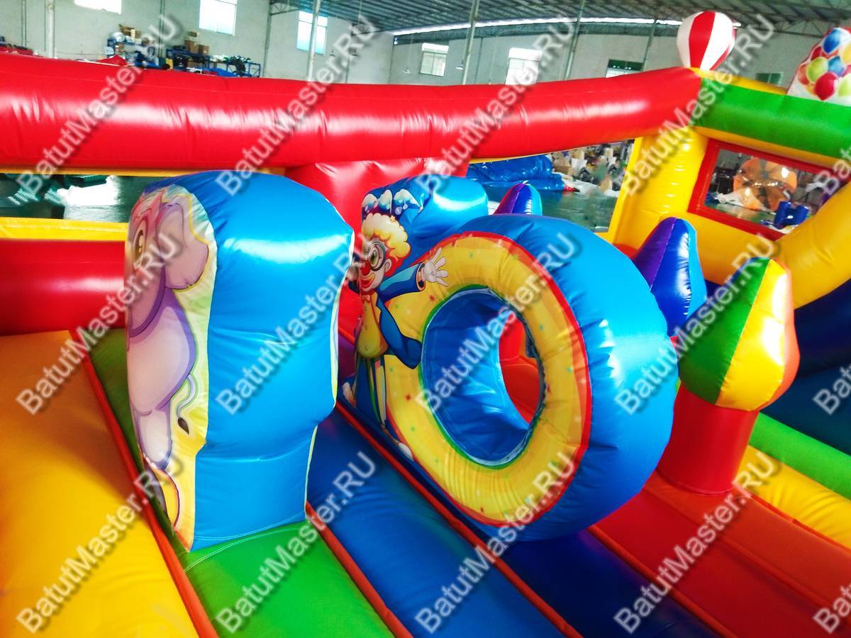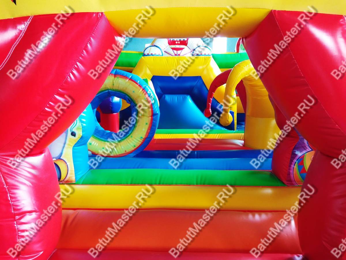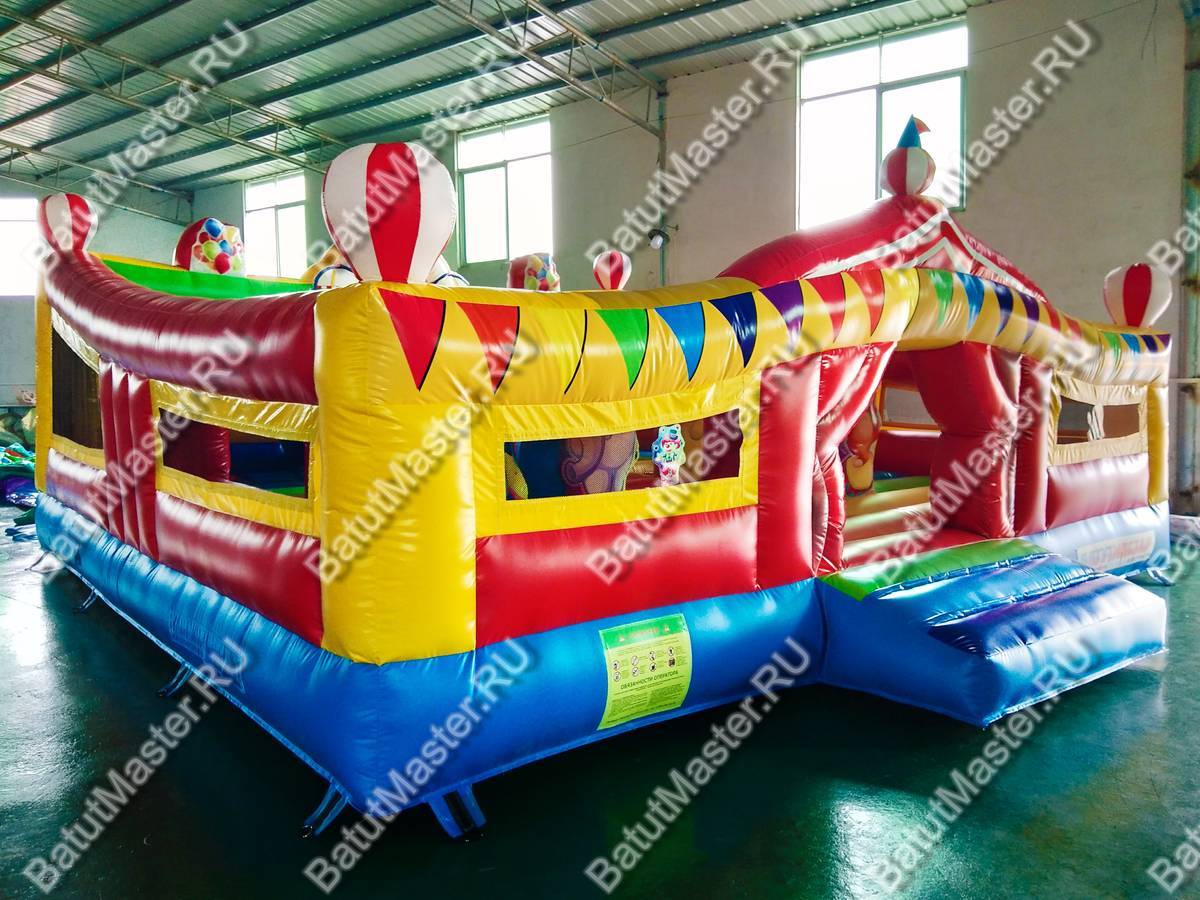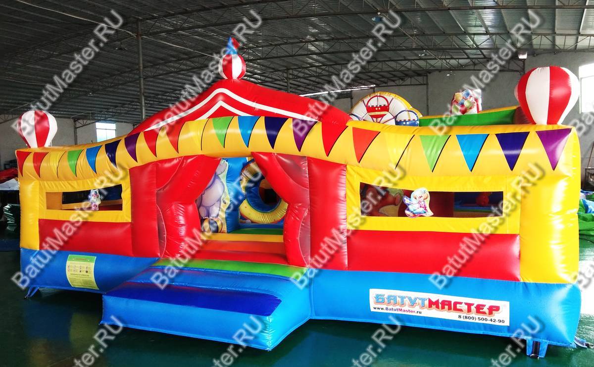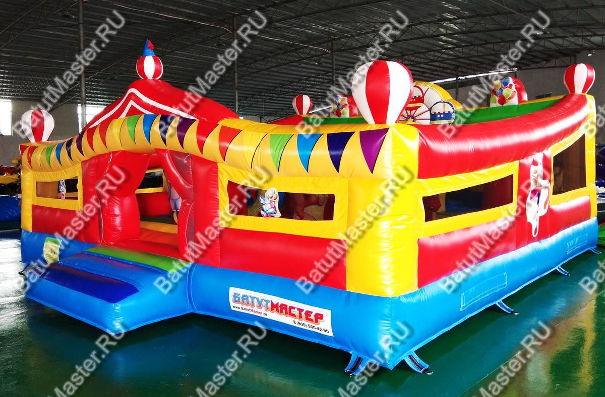 При одном только взгляде на этот надувной аттракцион в голове возникает мысль «вау», поскольку батут просто пестрит броскими цветами. По дизайну он похож на цирковой шатёр со всевозможными атрибутами: флажками, фонарями, разноцветными элементами. Внутри нисколько не хуже, нежели снаружи, поскольку там детишки встретятся с надувными фигурами клоунов, зверят и даже главными атрибутами цирка (например, колпаком шута). Также есть небольшая горка, с которой малыши с радостью будут кататься. Несмотря на больше количество деталей внутри батута, остаётся немало место для прыжков. Дети не будут тесниться и как-то мешать друг другу.
