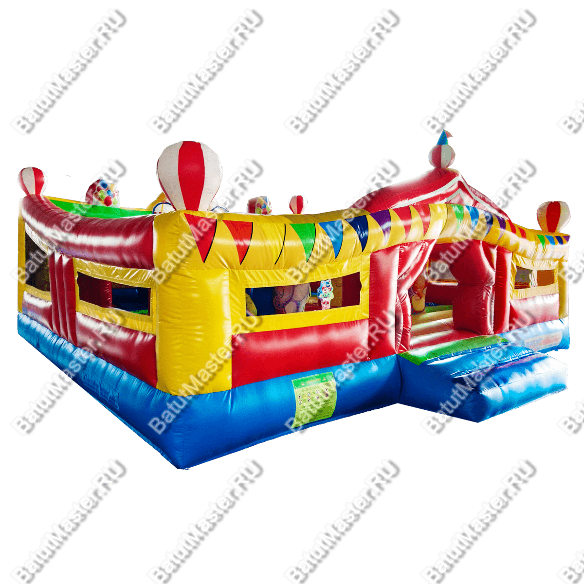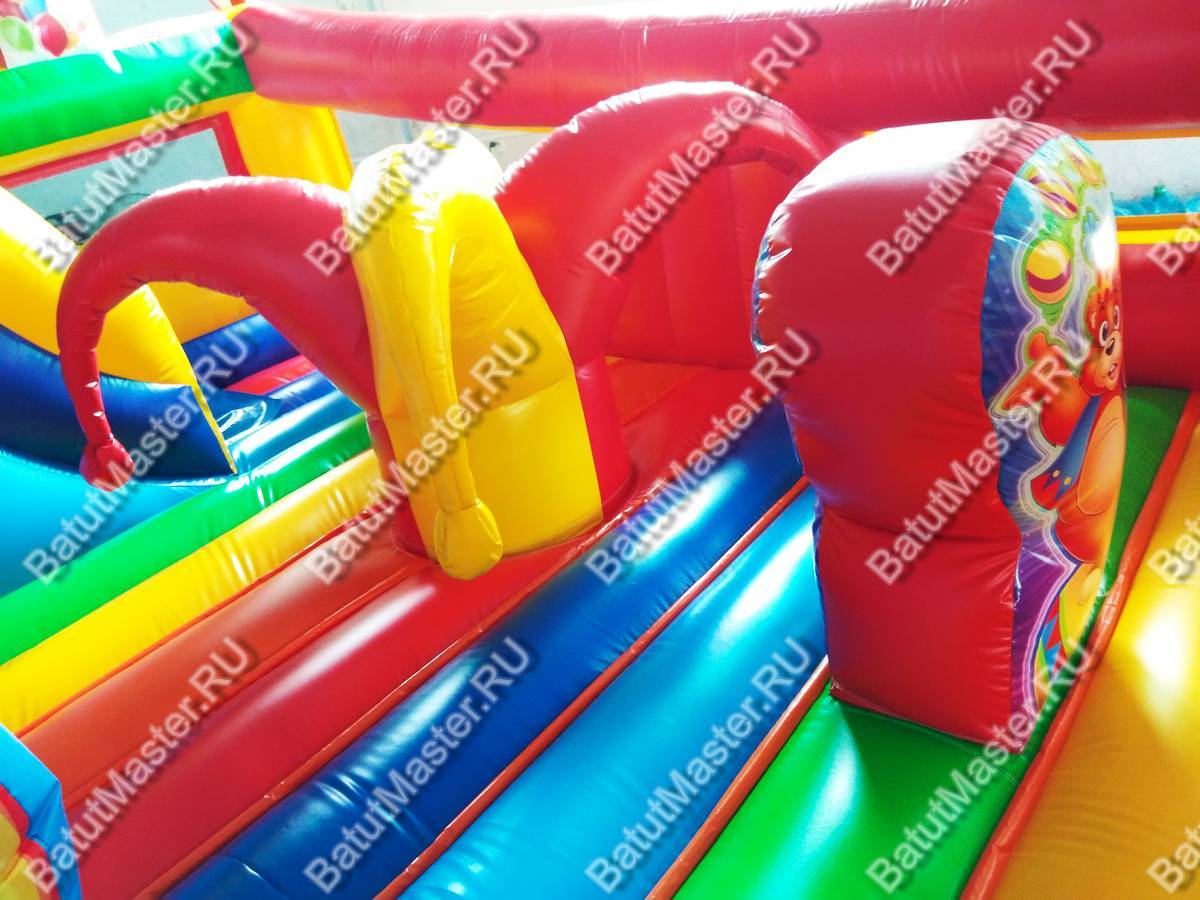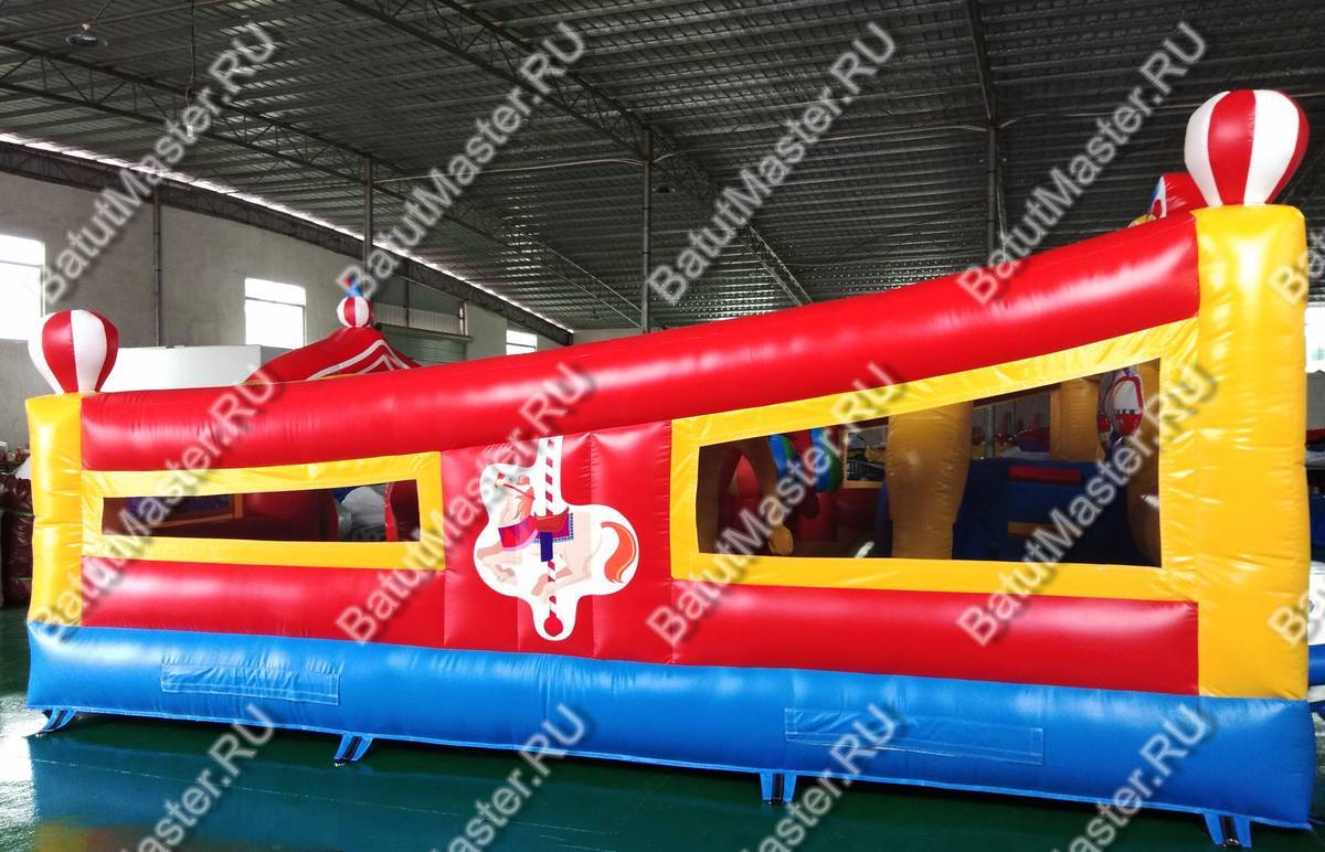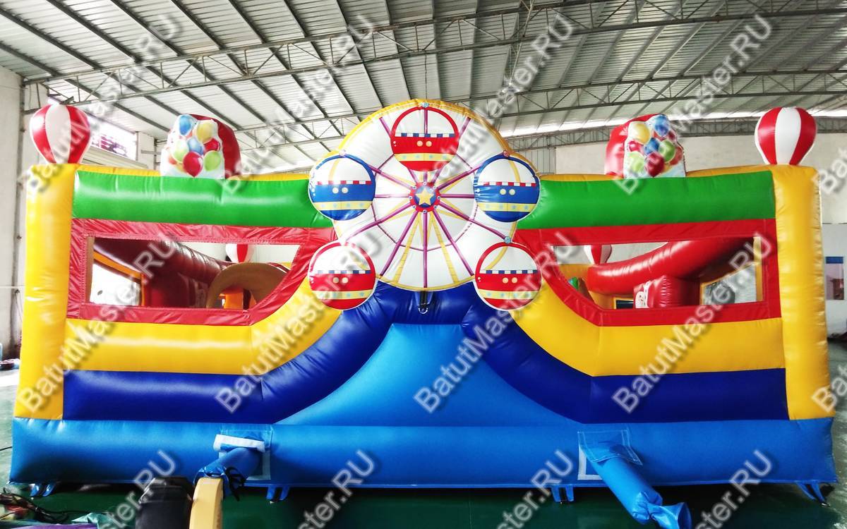 При одном только взгляде на этот надувной аттракцион в голове возникает мысль «вау», поскольку батут просто пестрит броскими цветами. По дизайну он похож на цирковой шатёр со всевозможными атрибутами: флажками, фонарями, разноцветными элементами. Внутри нисколько не хуже, нежели снаружи, поскольку там детишки встретятся с надувными фигурами клоунов, зверят и даже главными атрибутами цирка (например, колпаком шута). Также есть небольшая горка, с которой малыши с радостью будут кататься. Несмотря на больше количество деталей внутри батута, остаётся немало место для прыжков. Дети не будут тесниться и как-то мешать друг другу.