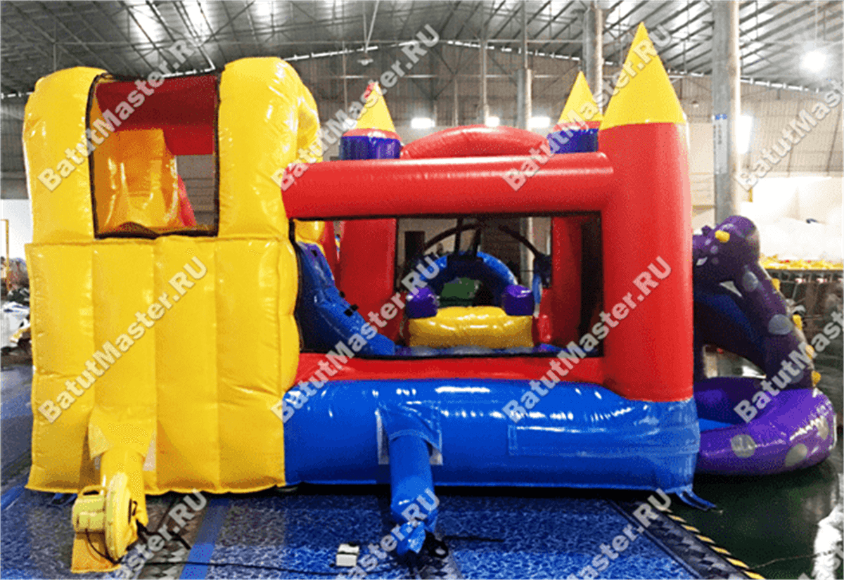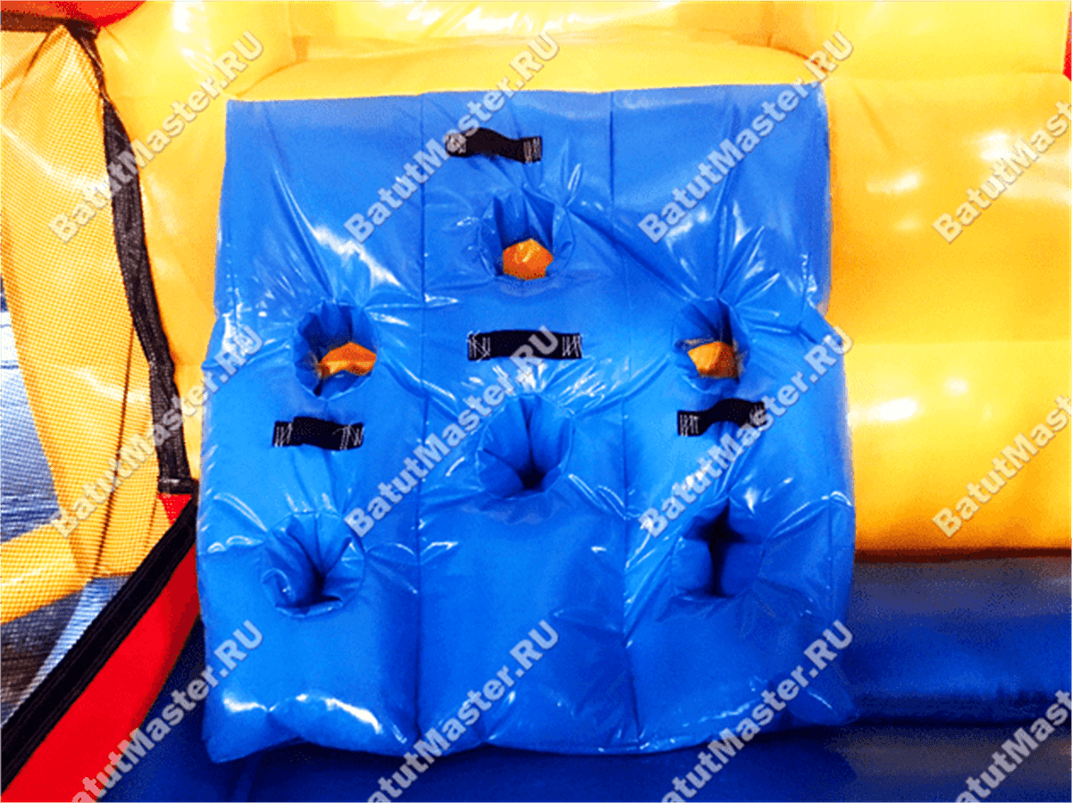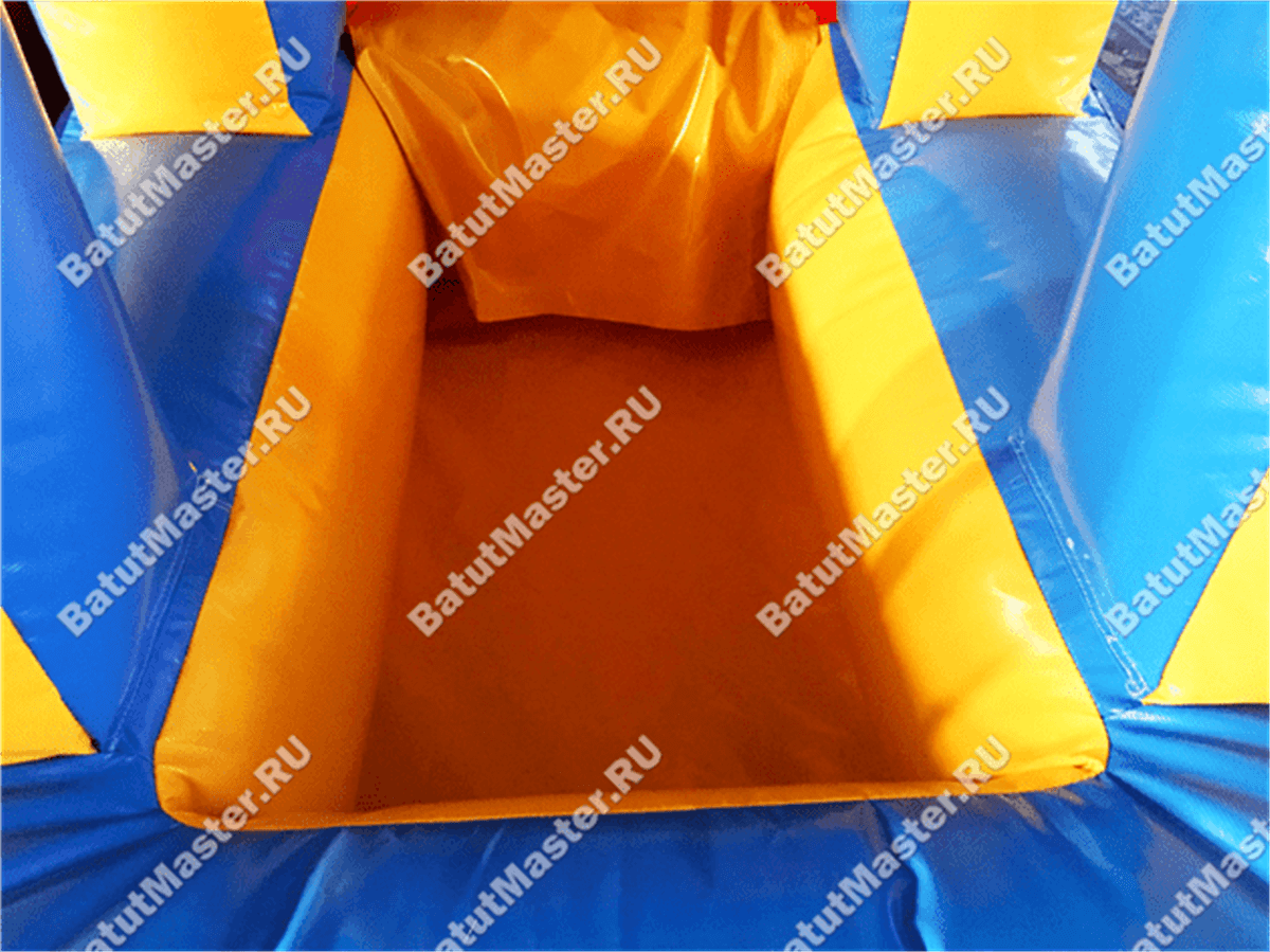 Самыми основными цветами в аттракционе являются синий, красный и желтый. Центральное место отведено под место для прыжков и бега, которое со всех сторон окружено высокими колоннами в виде башен. Батут из ПВХ с двумя горками, двумя бассейнами и основной мягкой площадкой можно легко назвать вместительным и многофункциональным, поэтому по поводу проходимости опасаться не стоит. Также здесь будет интересно любой возрастной группе детей, каждый найдет для себя занятие по душе