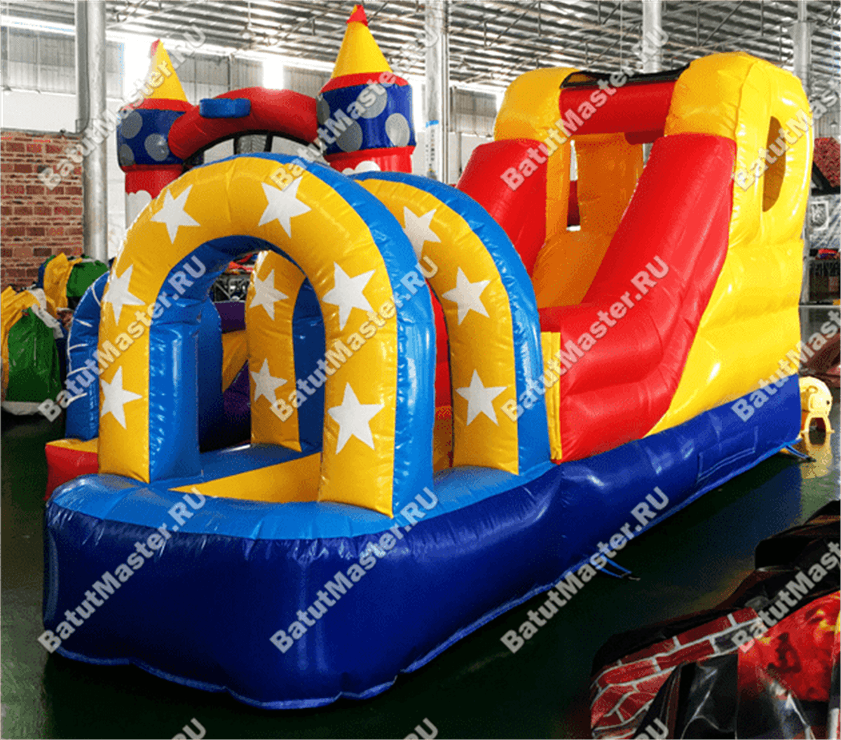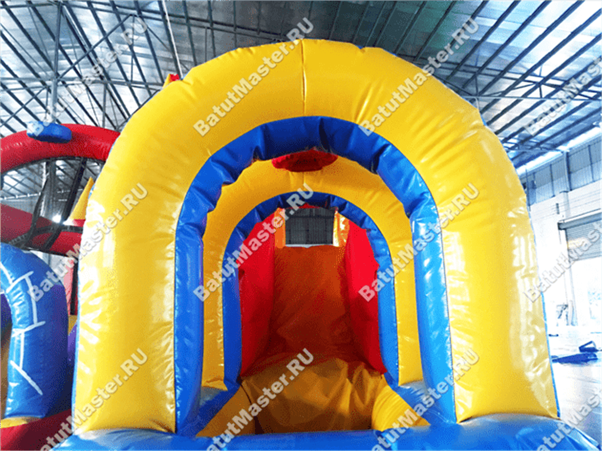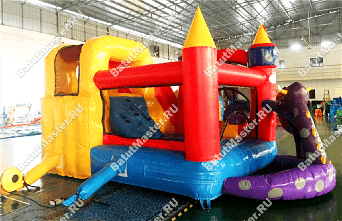 Самыми основными цветами в аттракционе являются синий, красный и желтый. Центральное место отведено под место для прыжков и бега, которое со всех сторон окружено высокими колоннами в виде башен. Батут из ПВХ с двумя горками, двумя бассейнами и основной мягкой площадкой можно легко назвать вместительным и многофункциональным, поэтому по поводу проходимости опасаться не стоит. Также здесь будет интересно любой возрастной группе детей, каждый найдет для себя занятие по душе