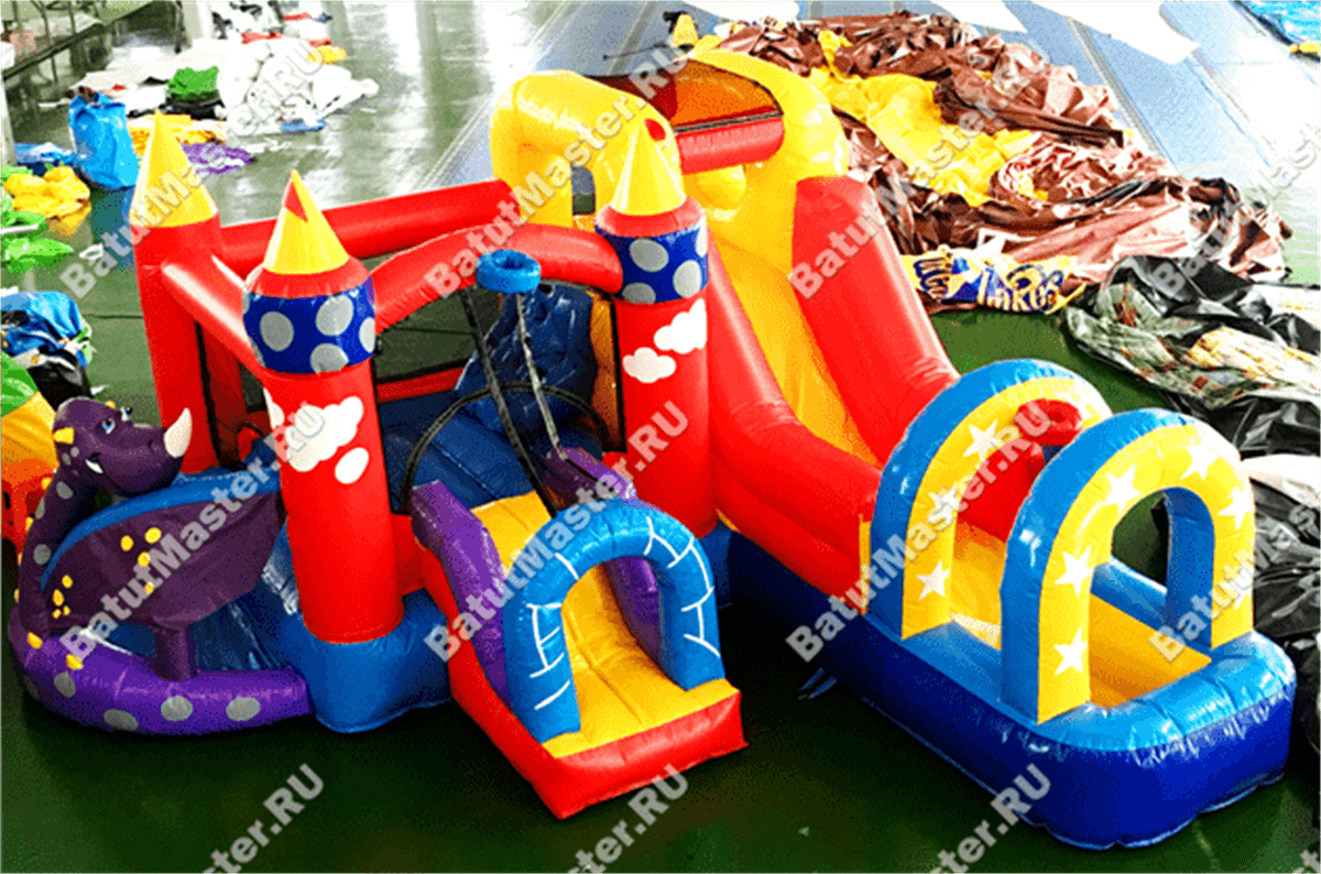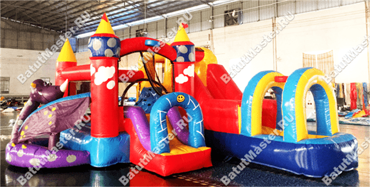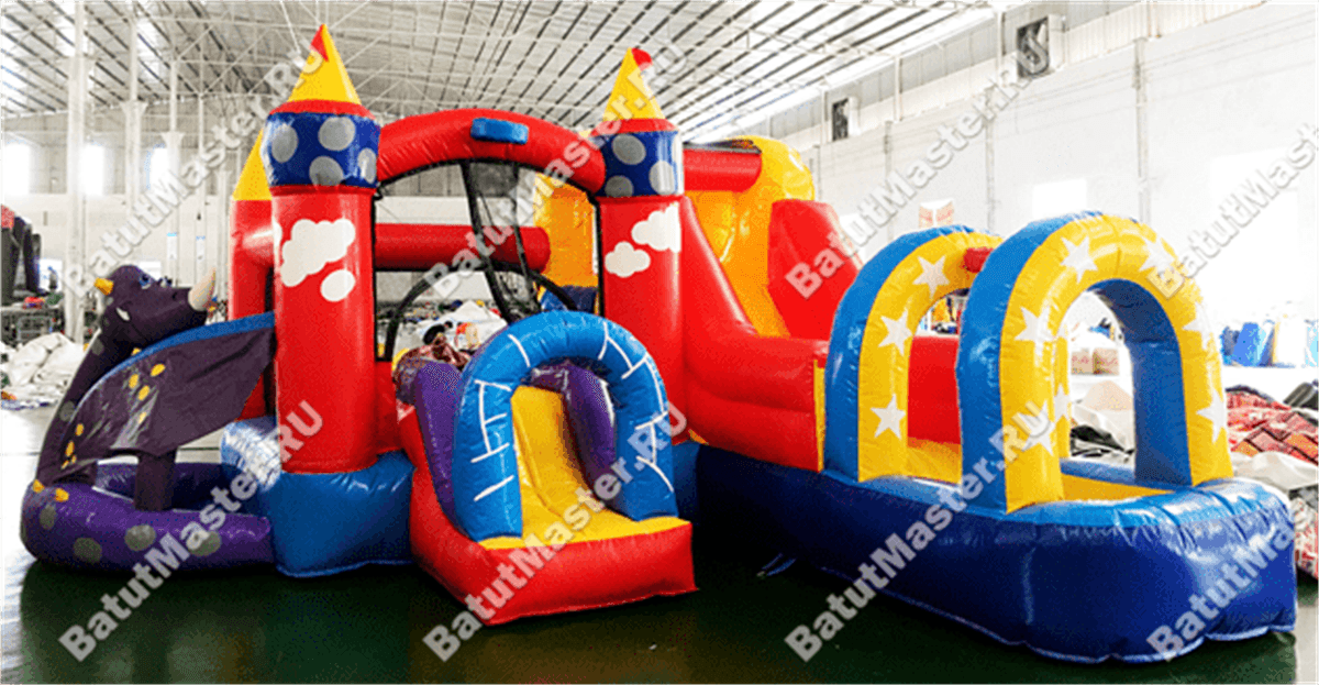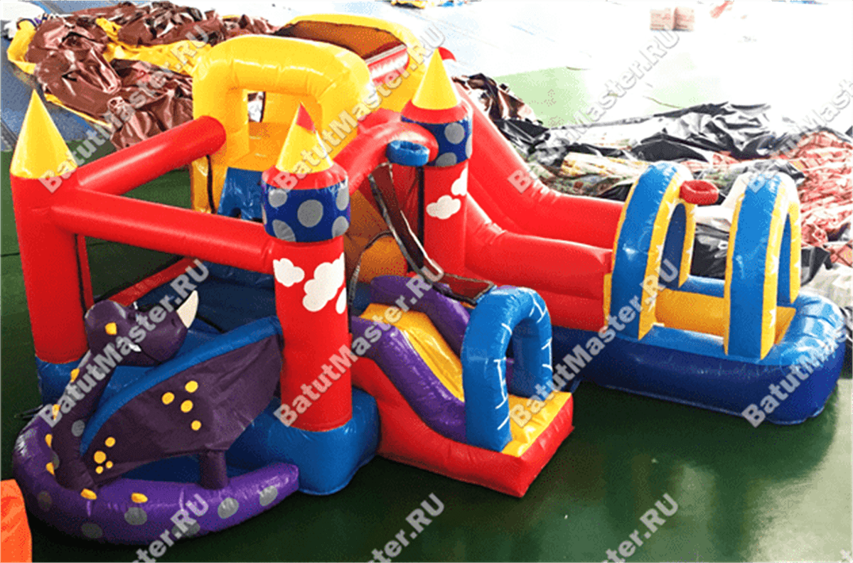Коммерческий батут из ПВХ поделен на множество зон и каждая из них яркая, привлекательная и функциональная. Одна из горок достаточно низкая, это говорит о том, что батут могут посещать даже самые маленькие, а с левой стороны всей конструкции есть небольшой сухой бассейн, прикрытый телом фиолетового дракона. Такой же точно резервуар предусмотрен и после спуска с правой, более высокой горки. Оба спуска на своем финише оборудованы яркими арками, над большей горкой предусмотрен навес из сетки, который спасает от нагревания материала летом.