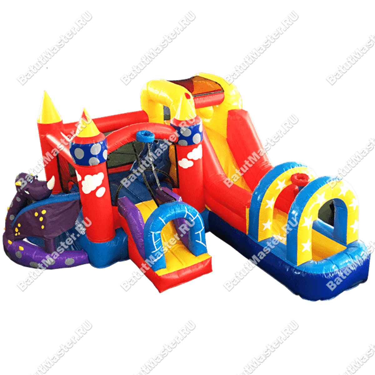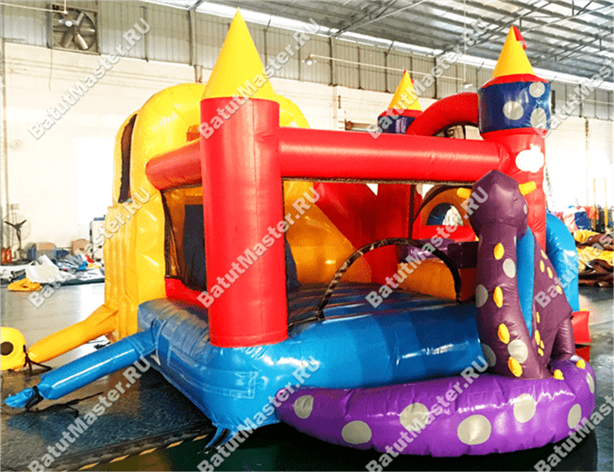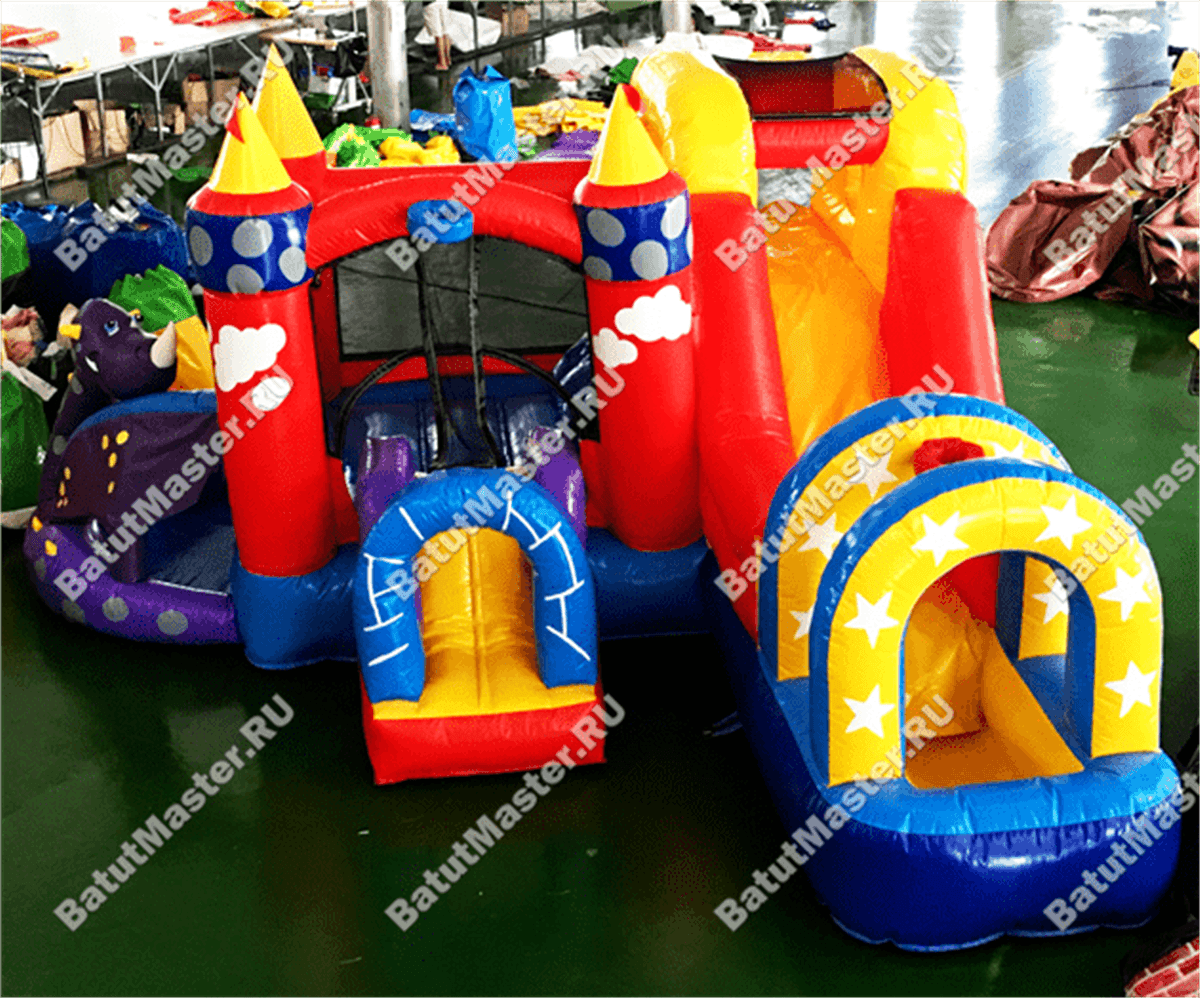 Коммерческий батут из ПВХ поделен на множество зон и каждая из них яркая, привлекательная и функциональная. Одна из горок достаточно низкая, это говорит о том, что батут могут посещать даже самые маленькие, а с левой стороны всей конструкции есть небольшой сухой бассейн, прикрытый телом фиолетового дракона. Такой же точно резервуар предусмотрен и после спуска с правой, более высокой горки. Оба спуска на своем финише оборудованы яркими арками, над большей горкой предусмотрен навес из сетки, который спасает от нагревания материала летом.