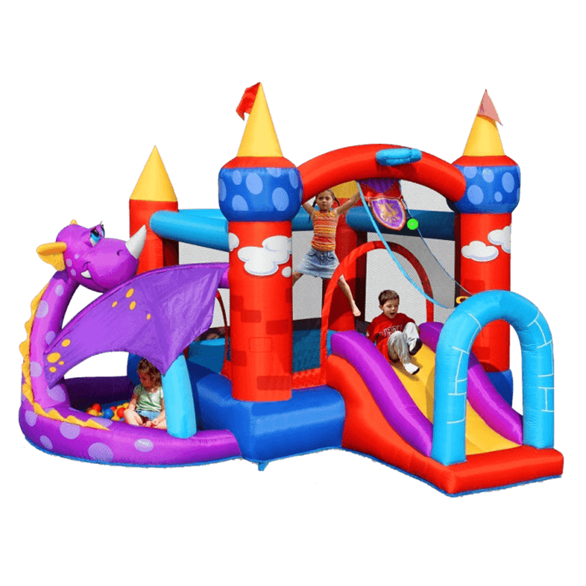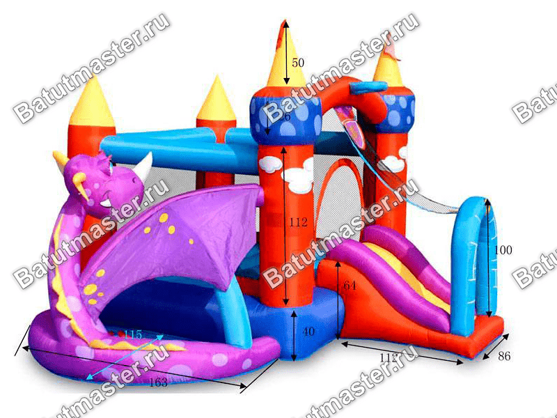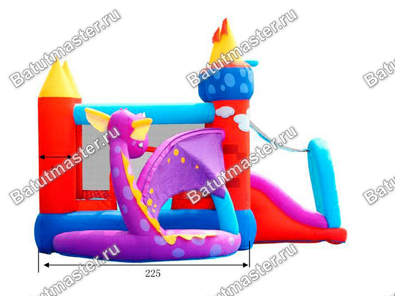 Необычный батут с добрым драконом, горкой и двумя площадками.