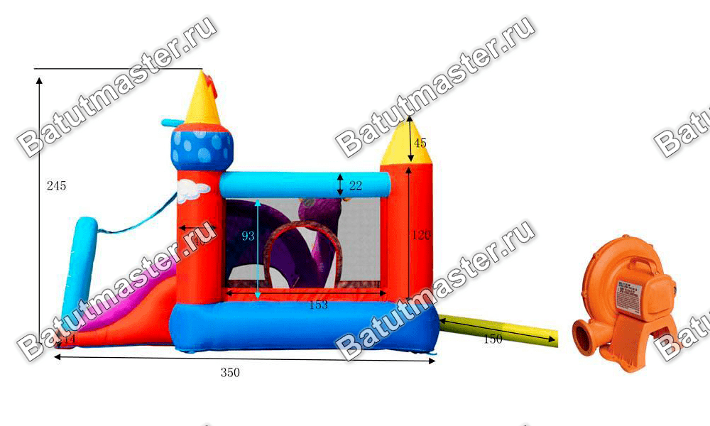Необычный батут позволяет собрать в себе все возрастные детские категории. Здесь можно просто прыгать, съезжать с горки или играть с разноцветными мячиками. Есть защитная сетка.