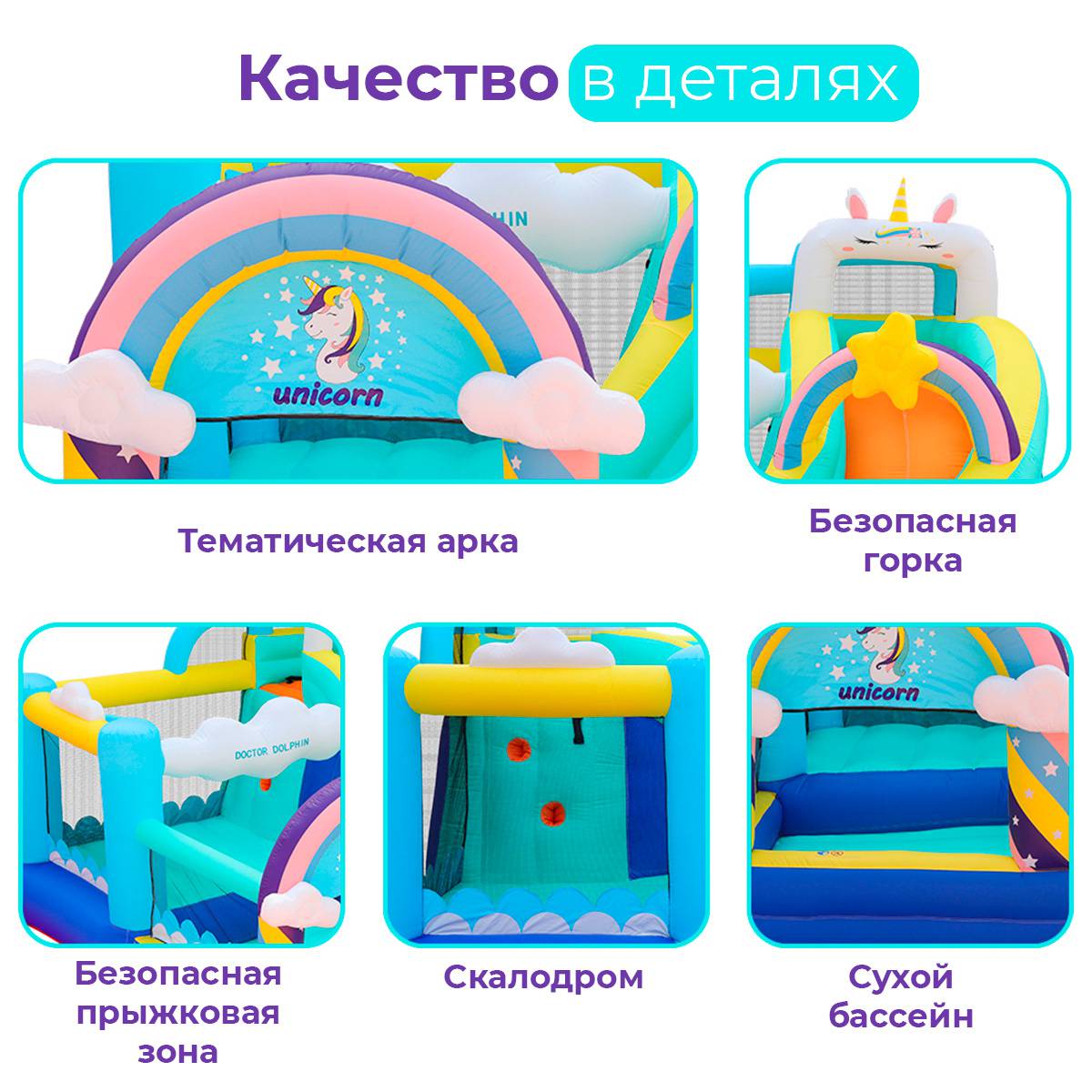 Представьте, как ваши дети весело и с радостью прыгают, катятся с горки и взбираются на скалодром — все это возможно с надувным батутом «Единорог». Этот яркий и красочный игровой комплекс превращает любой уголок в настоящий островок счастья и активности. С каждым прыжком и скольжением ваши дети будут развивать координацию, ловкость и физическую выносливость, а также получать море удовольствия от приключений в мире единорогов. Простота установки, высокое качество материалов и безопасность делают его идеальным выбором для активных игр в домашних условиях, на даче или в любом другом пространстве, где вы хотите создать атмосферу радости и веселья.