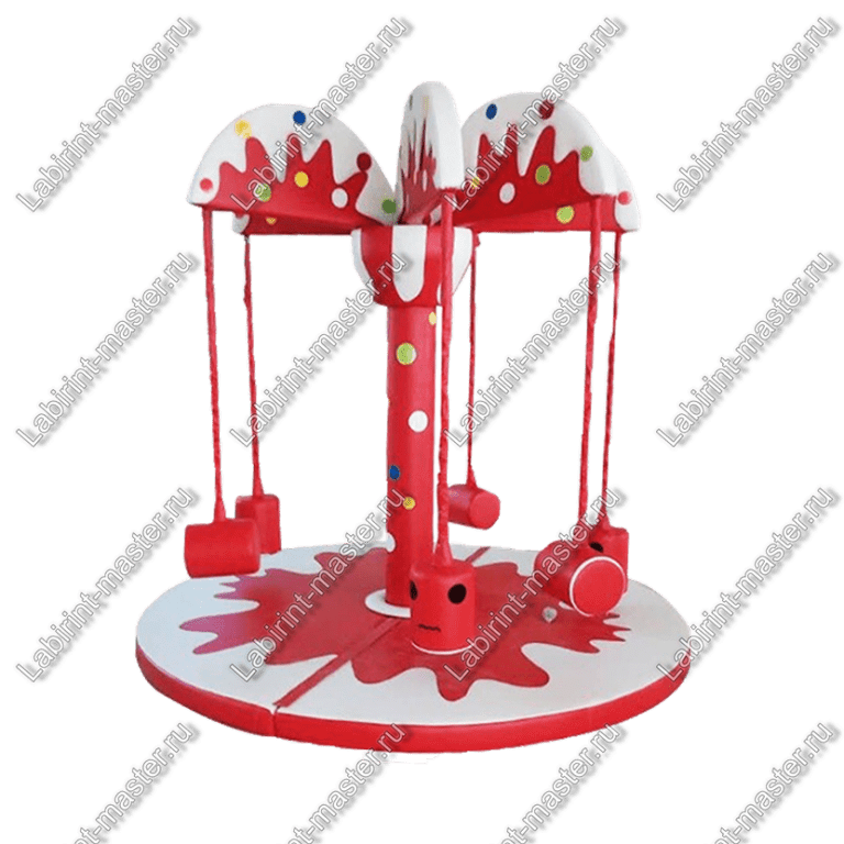 Ярко-красная карусель, разбавленная разноцветными кружочками. Дети точно останутся под впечатлением только от одного внешнего вида аттракциона: необычные сидения, интересный дизайн и возможность повеселиться на ней.