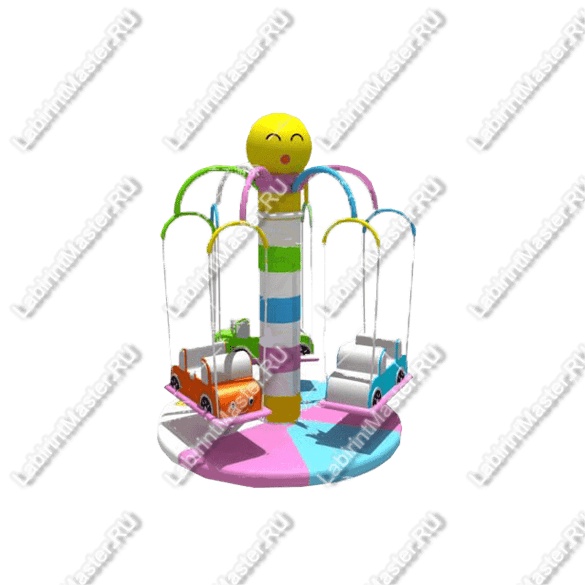 Первое, что привлекает внимание детей – это яркий и запоминающийся дизайн. Уже на входе в игровую зону ребят встретит весёлый жёлтый смайл, расположенный в центре конструкции. Посадочные места выполнены в виде гоночных машин, что позволяет детям не просто кататься, а почувствовать себя настоящими гонщиками. Особенно это понравится мальчикам, ведь автомобили и скорость – это то, что их привлекает с раннего детства.Каждая машинка выполнена в разном цвете, поэтому ребёнок сможет выбрать свой любимый оттенок. Такая разноцветная палитра делает карусель визуально насыщенной, придавая ей живость и привлекательность.