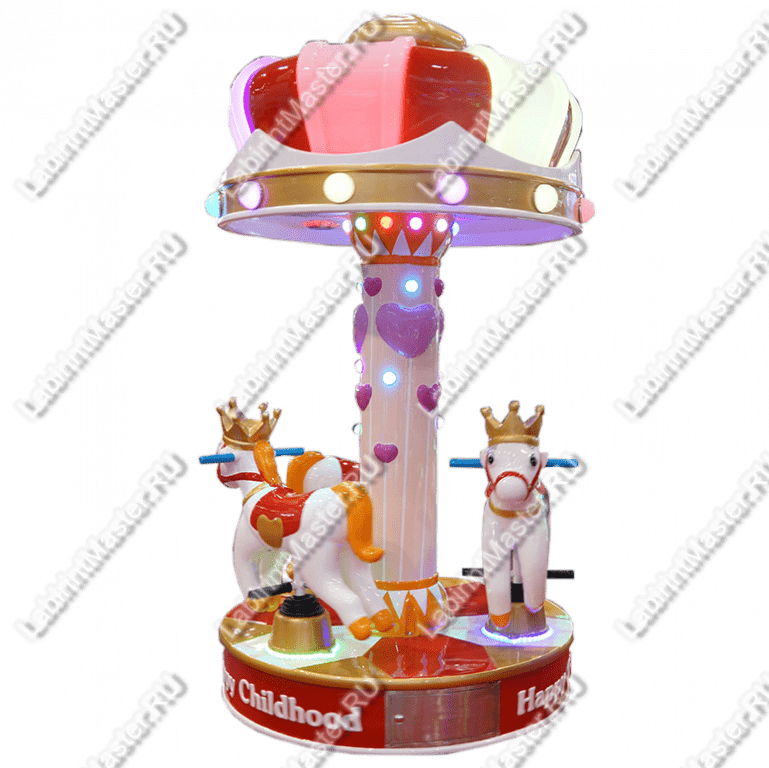 Эта детская карусель с лошадками точно влюбит в себя каждого ребёнка. Аттракцион словно сошёл с экранов телевизоров или со страниц сказок. Внешний вид карусели может заворожить не только ребёнка, но и взрослого, что в какой-то мере полезно для бизнеса. Карусель буквально сияет глянцевыми красками и искусственной позолотой, а этот эффект, в свою очередь, усиливается различными разноцветными лампочками. От такой игры цвета и света дети придут в неописуемый восторг, а это самое главное.