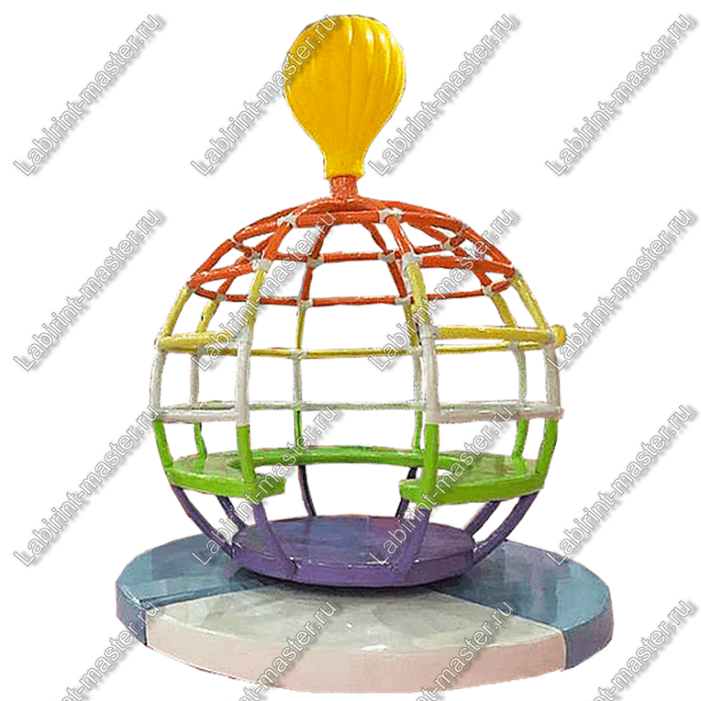 Карусель работает от электрического привода, который обеспечивает плавное и безопасное вращение конструкции. Дети садятся на полукруглую скамью внутри шара и держатся за поручни. Механизм запускает движение платформы, создавая лёгкое вращение без резких рывков.