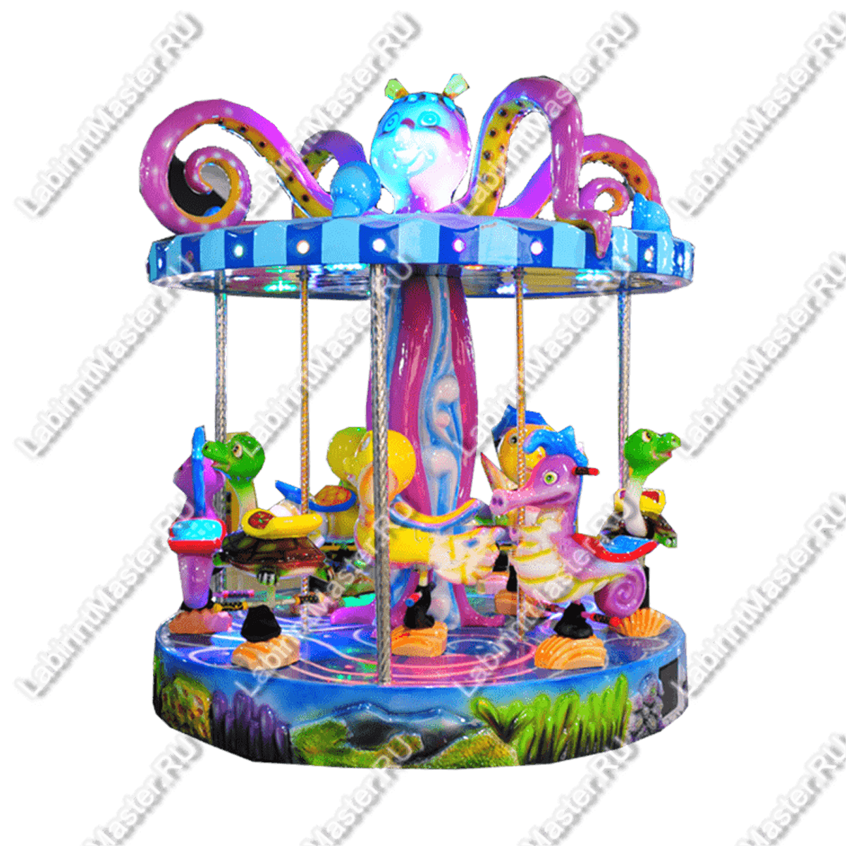 Центральный элемент – фигура морского существа – служит не только украшением, но и элементом конструкции, придающим карусели оригинальность. Посадочные места выполнены в виде морских животных, что делает поездку ещё более интересной для детей.