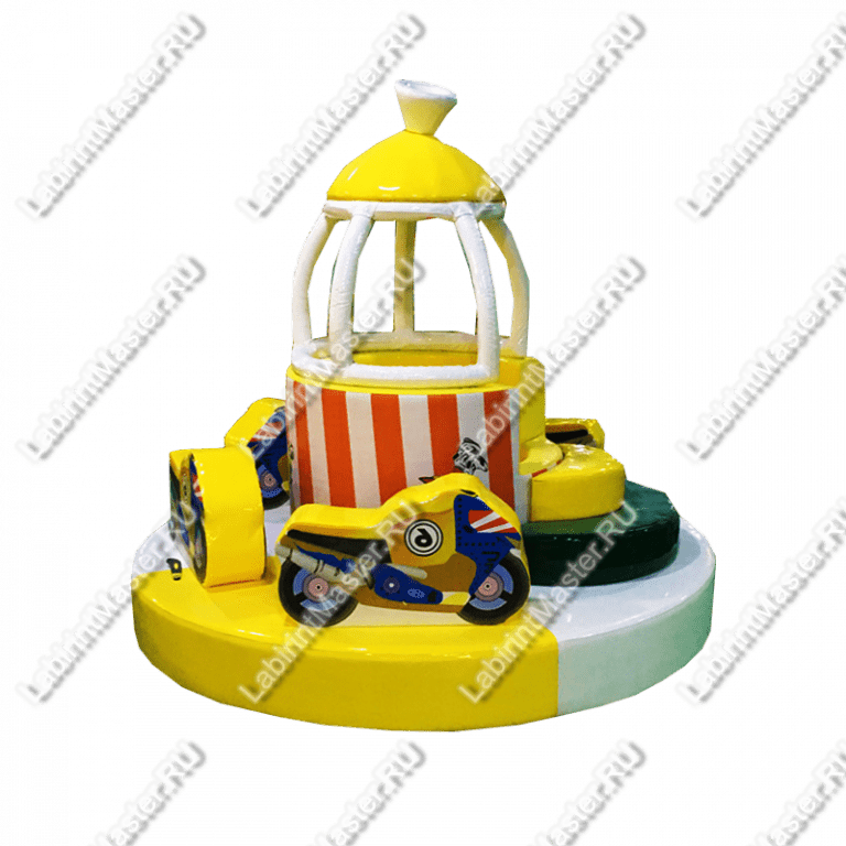 Детская карусель имеет очень яркий внешний вид, благодаря солнечному жёлтому цвету. Такая особенность порадует маленьких посетителей, ведь цвета играют для них очень важную роль. Аттракцион отличается интересным, но простым дизайном, что позволяет установить его в практически любую игровую зону, что, несомненно, является большим плюсом для бизнеса. Карусель имеет большое сферическое основание, по которому удобно ходить. Сидения для детей выполнены в виде спортивных мотоциклов, мчащихся друг за другом, что придаст интереса в игровой процесс. Помимо мотоциклов, по центру располагается пьедестал в виде беседки. К центру ведёт небольшая лестница, что делает передвижение удобным и доступным даже для самых маленьких участников.