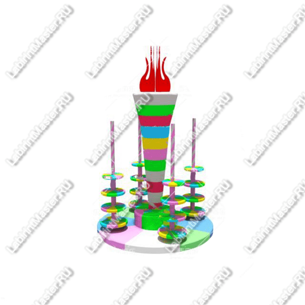 Рядом с «факелом» стоит несколько необычных конструкций: прямая разноцветная палка и прикреплённые диски на ней. Они добавляют дополнительный игровой потенциал и позволяют детям активно взаимодействовать с элементами карусели. Такой дизайн не только радует глаз, но и стимулирует развитие координации движений у малышей.