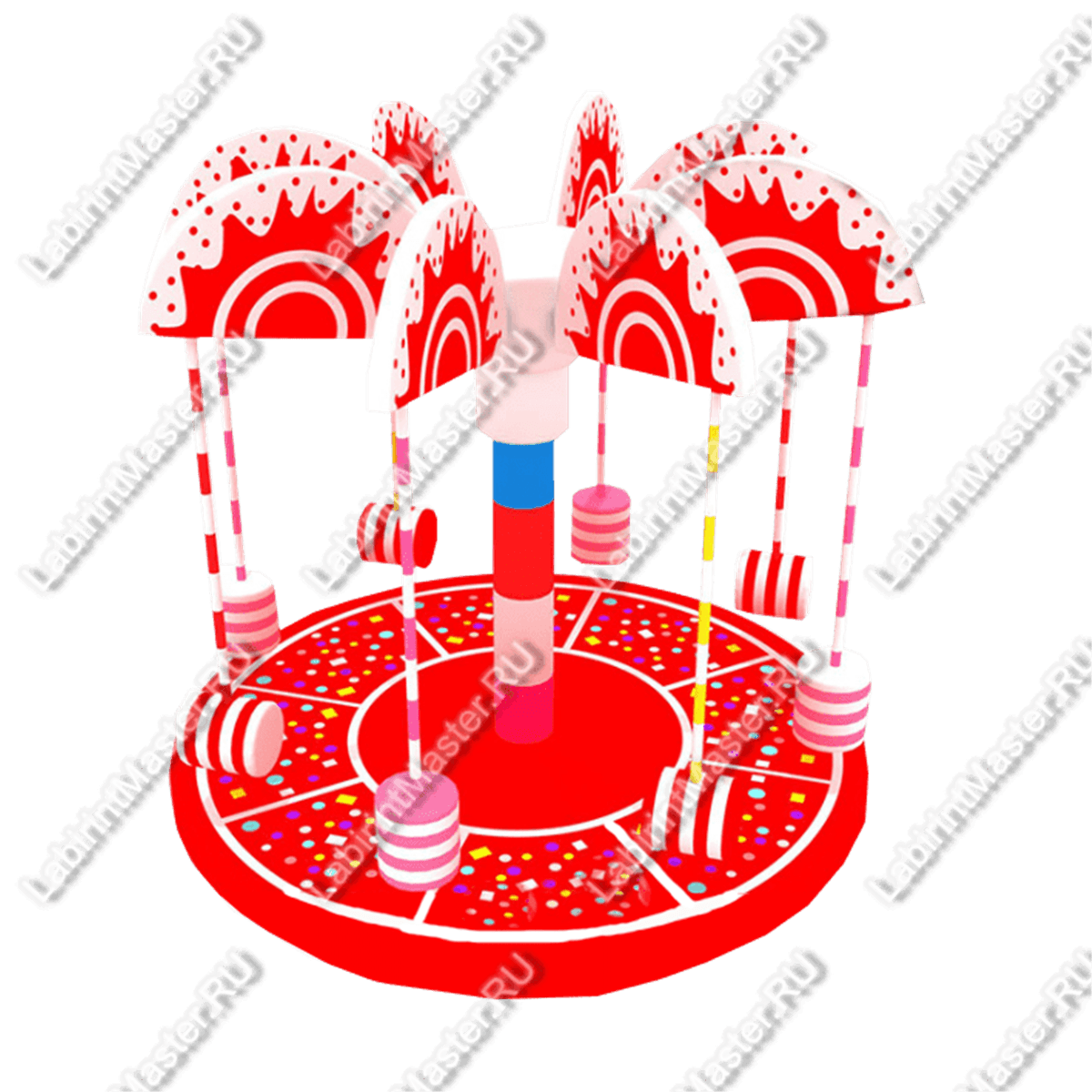 - Декор в стиле сладостей: белая «глазурь» и разноцветные конфетти, украшающие карусель, делают её похожей на праздничный десерт. Такой визуальный образ пробуждает у детей ассоциации с чем-то вкусным и приятным.