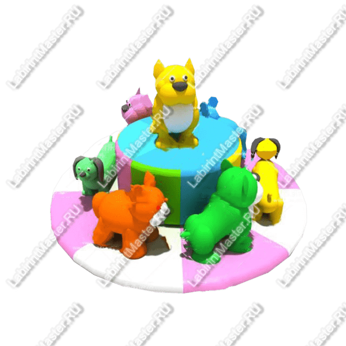 Весь аттракцион состоит в основном из разноцветных собачек. Одна из них возвышается, стоя на самом верху конструкции, выделяясь насыщенно-жёлтым цветом. Остальные пёсики расположены чуть ниже – именно на них дети могут прокатиться. Каждая собачка окрашена в свой уникальный цвет, что делает карусель ещё более привлекательной. Девочкам наверняка понравится розовый бульдог, а мальчики могут прийти в восторг от оранжевого с красными глазами. Такая яркая и жизнерадостная палитра стимулирует интерес у малышей и делает аттракцион визуально эффектным.