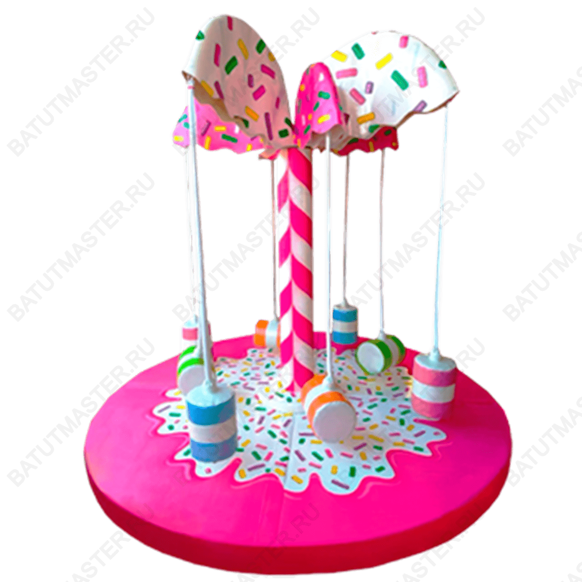 Центральная колонна в виде сахарной трости, разноцветные зонтики с «глазурью» и «посыпкой», а также сиденья, напоминающие аппетитные конфеты, делают эту карусель настоящим украшением любой детской зоны. Конструкция карусели предусматривает безопасное использование как внутри помещений, так и на открытых территориях при соблюдении правил эксплуатации.