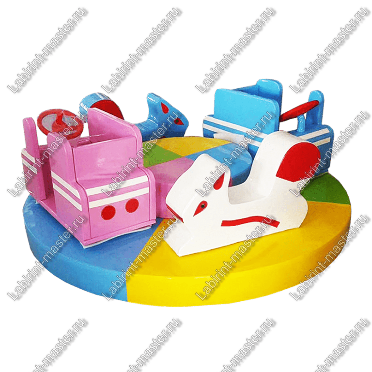 Игровой лабиринт заметно преобразится с появлением данной карусели. Её сидения сделаны в виде белочек и машинок, причём все они разного цвета. У ребёнка появится выбор: он сможет сесть на ту, которая окрашена в его любимый оттенок. Такой дизайн способствует развитию воображения у детей, создавая игровую атмосферу, полную приключений.