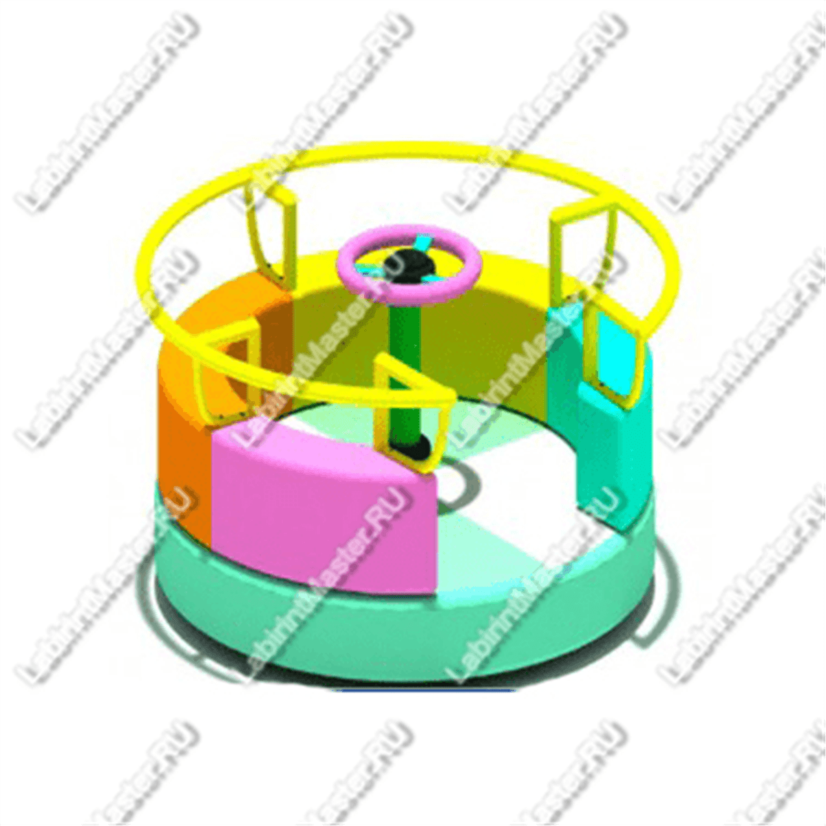 Яркая расцветка карусели сразу привлекает внимание детей. Она оформлена в сочных зелёных, розовых, жёлтых и голубых оттенках, что делает её особенно привлекательной для малышей. Посадочная зона выполнена в форме мягкой скамьи, позволяя детям свободно занимать место, а центральный руль добавляет интерактивности, позволяя регулировать вращение. Благодаря простоте конструкции ребёнку легко и комфортно играть, что делает этот аттракцион идеальным выбором для детских игровых площадок.