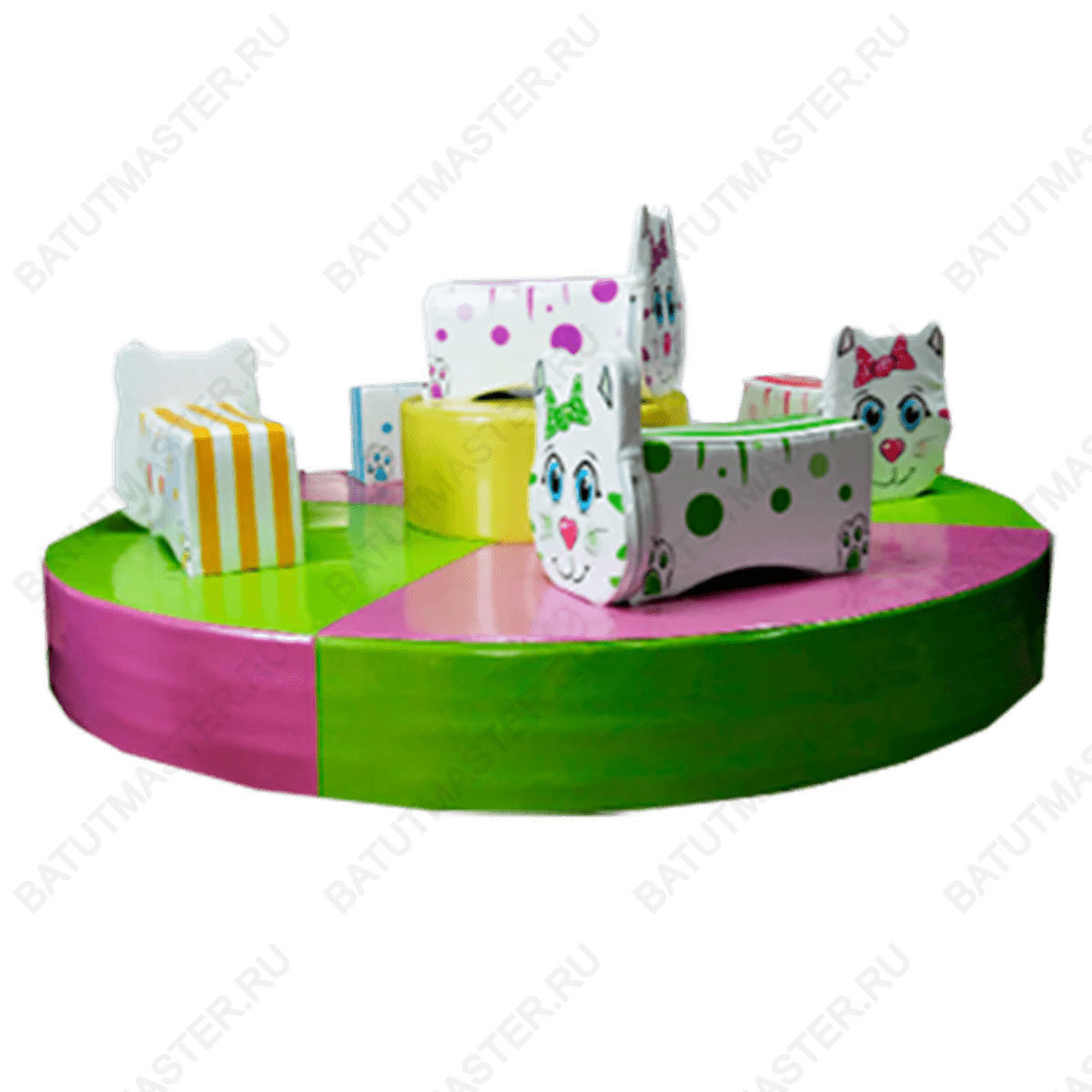 Основой карусели служит устойчивая платформа, на которой размещены удобные посадочные места в виде седел, выполныенных в виде котят. Это привлекает внимание малышей и делает процесс игры захватывающим и увлекательным. Максимальная вместимость оборудования – до 4 детей одновременно, что позволяет им наслаждаться совместной игрой в безопасной и дружественной атмосфере.