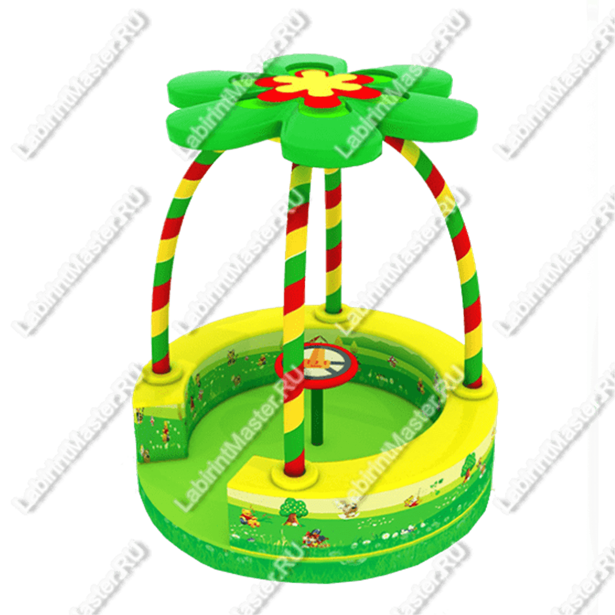 Детская карусель "Волшебный цветок" расцветка дарит атмосферу летней теплоты и уюта, что, несомненно, понравится каждому ребёнку. Особенностью конструкции является крыша в виде большого цветка, поддерживаемая красочными прутьями. На низкое основание легко взбираться, а цельное круговое сидение очень удобно и способно вместить больше детей. Прутья служат как поручни, а для тех, кто не дотягивается, есть круглая ручка посередине.