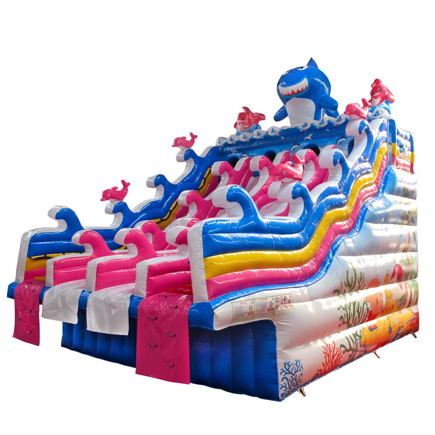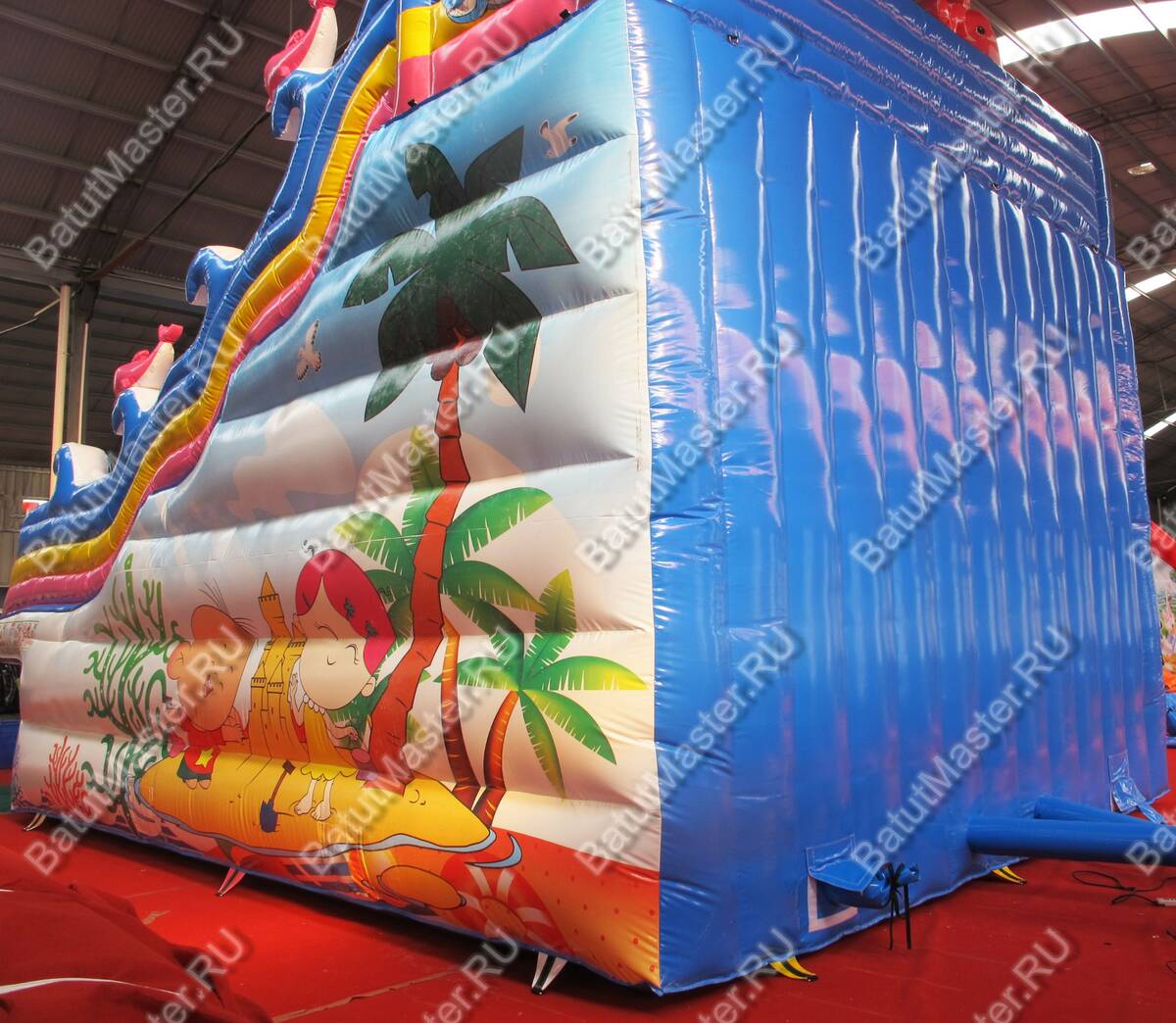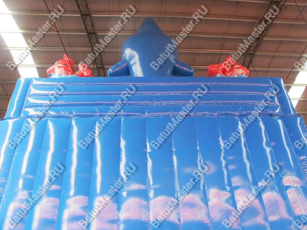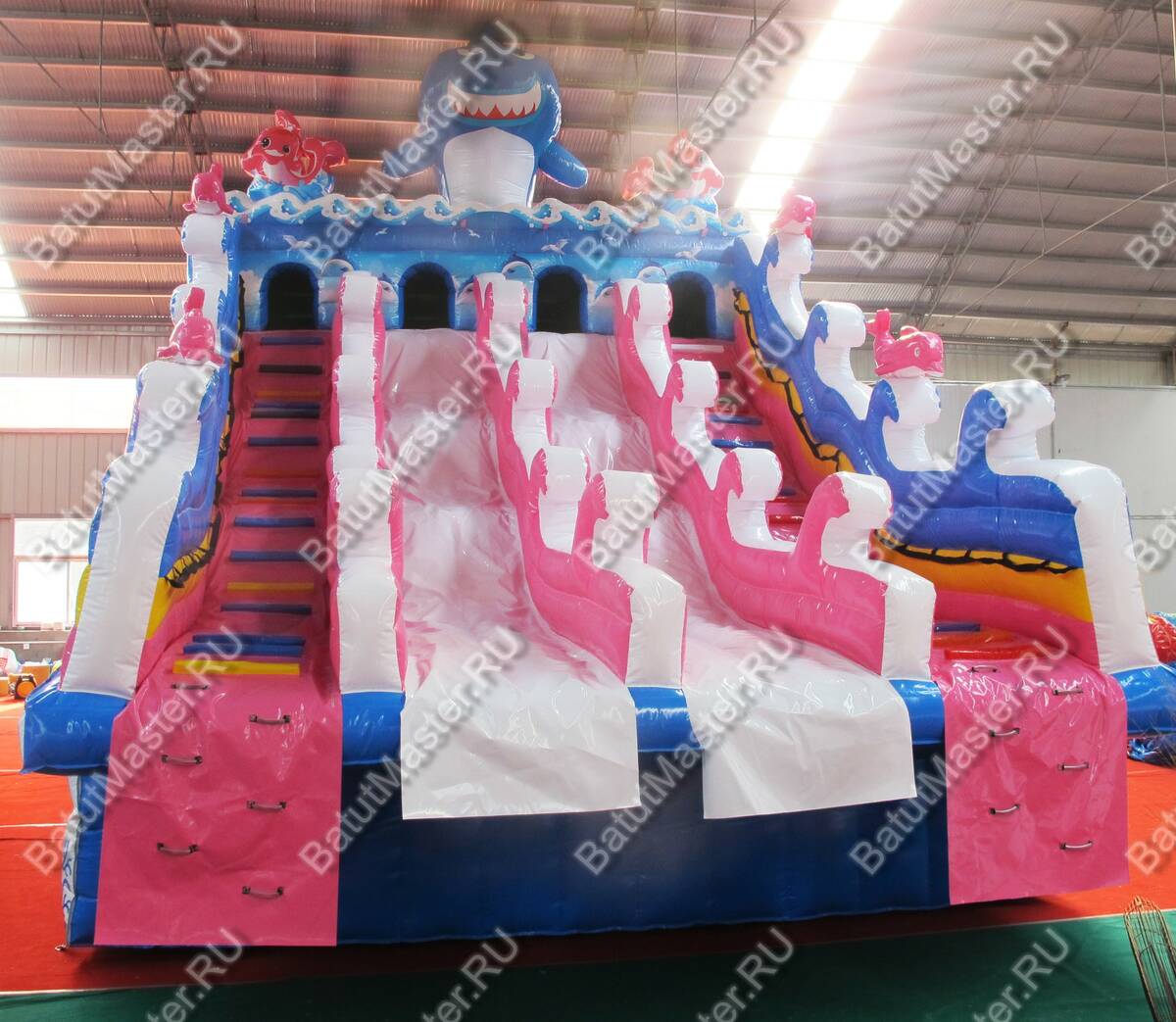 Большая надувная горка для бассейна «Песни моря» способна преобразить любой бассейн и стать любимым аттракционом для всей семьи. Эта надувная горка будет заметна даже издалека благодаря яркому многообразию цветов и декоративным надувным фигурам. Цветастые волны на горке создают впечатления сказочного морского путешествия, и при скоростном скате они смотрятся очень красиво. Стены горки украшены розовыми дельфинами, а над всем аттракционом возвышается надувная фигура акулы. Также на горке красуется большой принт с изображением морского дна.
