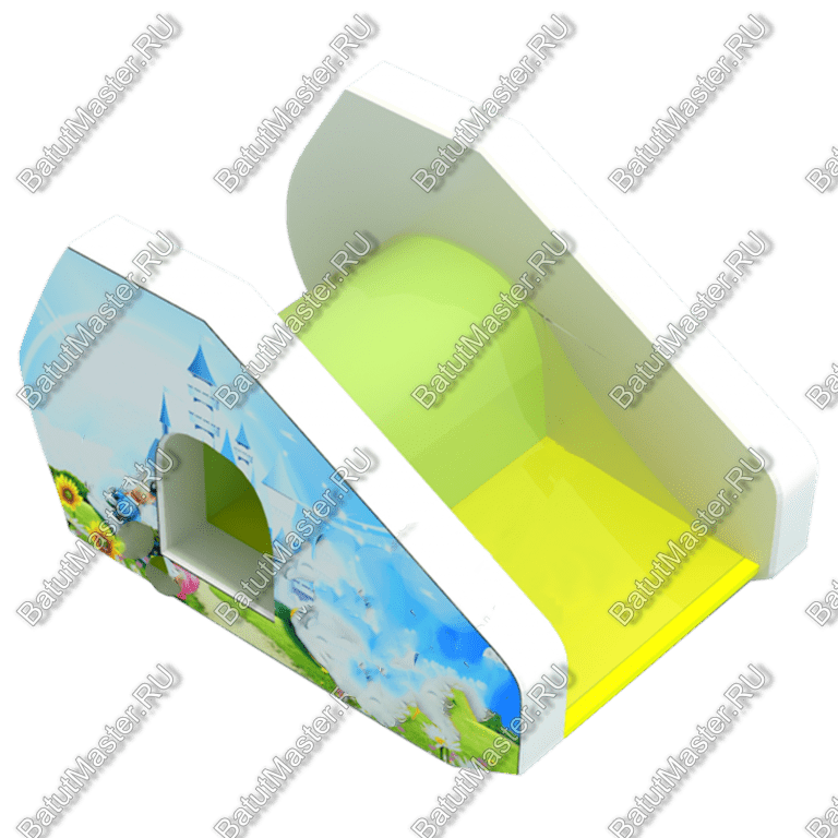 Горка представляет собой конструкцию из двух боковых стенок, между которыми закреплено прозрачное полотно с изменяющейся высотой, что обеспечивает непринужденное скатывание. Между двумя боковыми стенками есть тоннель, оборудованный окошком, который также представляет интерес для малышей. Горка имеет подсветку, которая стилизует ее под водопад. Такой эффект особенно хорошо воспринимается в вечернее время. Подсветка работает от сети с напряжением 220 Вольт.