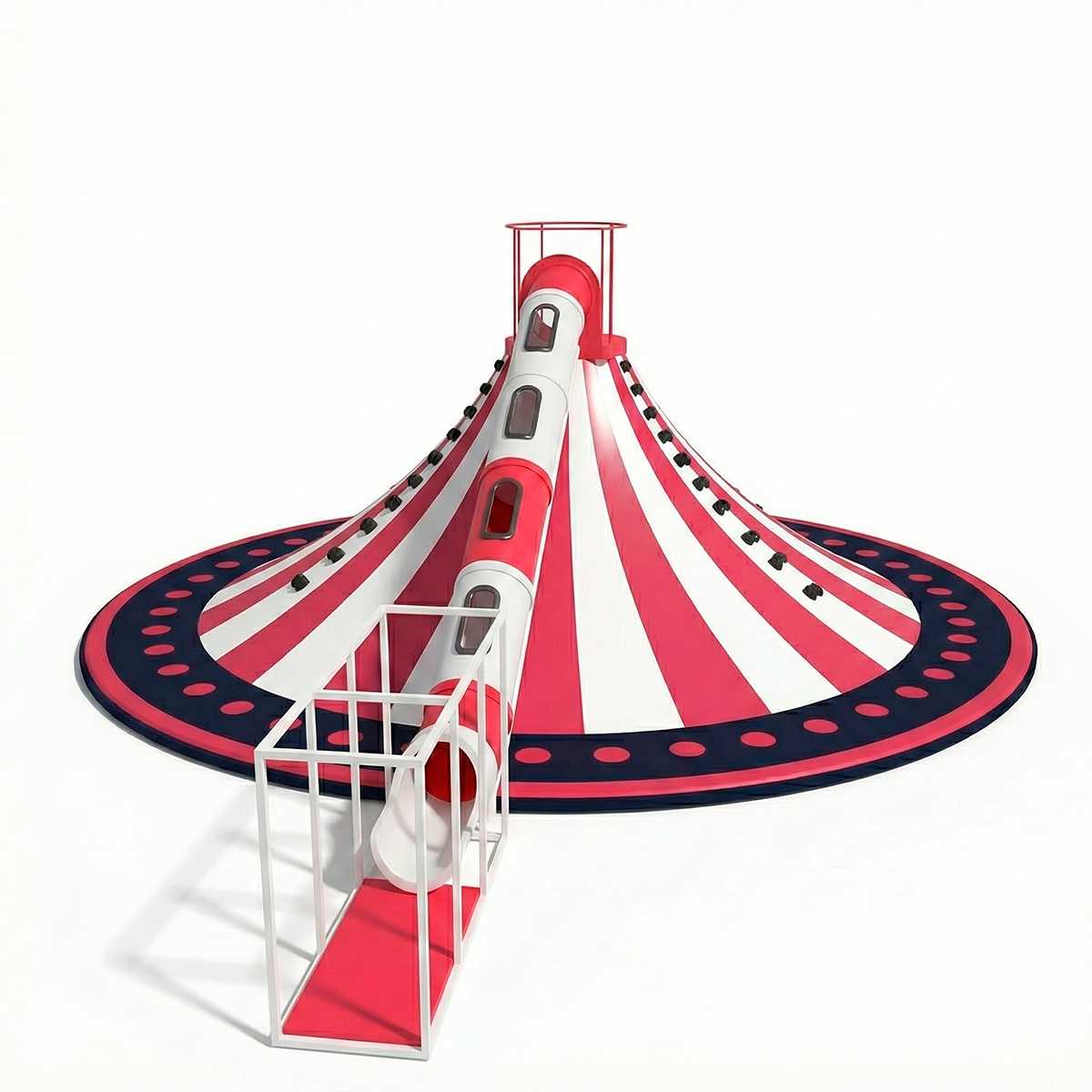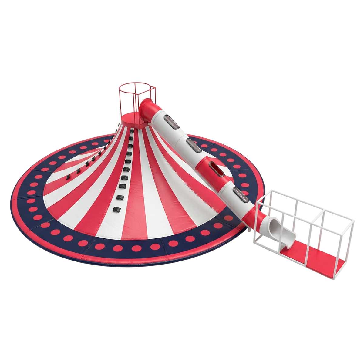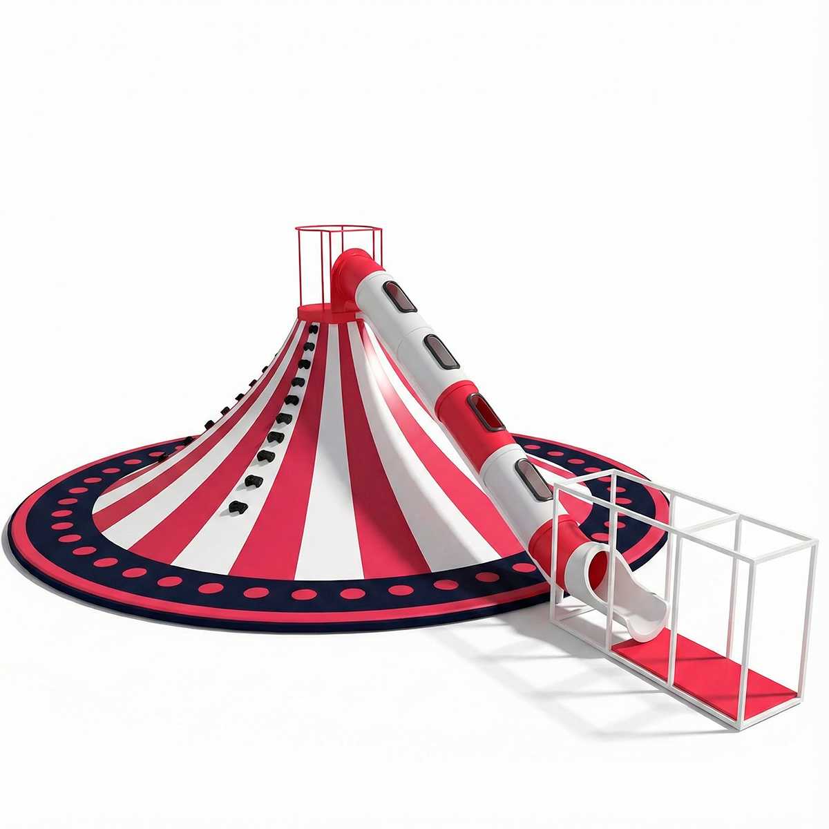 - Яркий и привлекательный дизайн: Элементы циркового дизайна с яркими полосами и кругами делают аттракцион привлекательным для детей и добавляют динамичности.