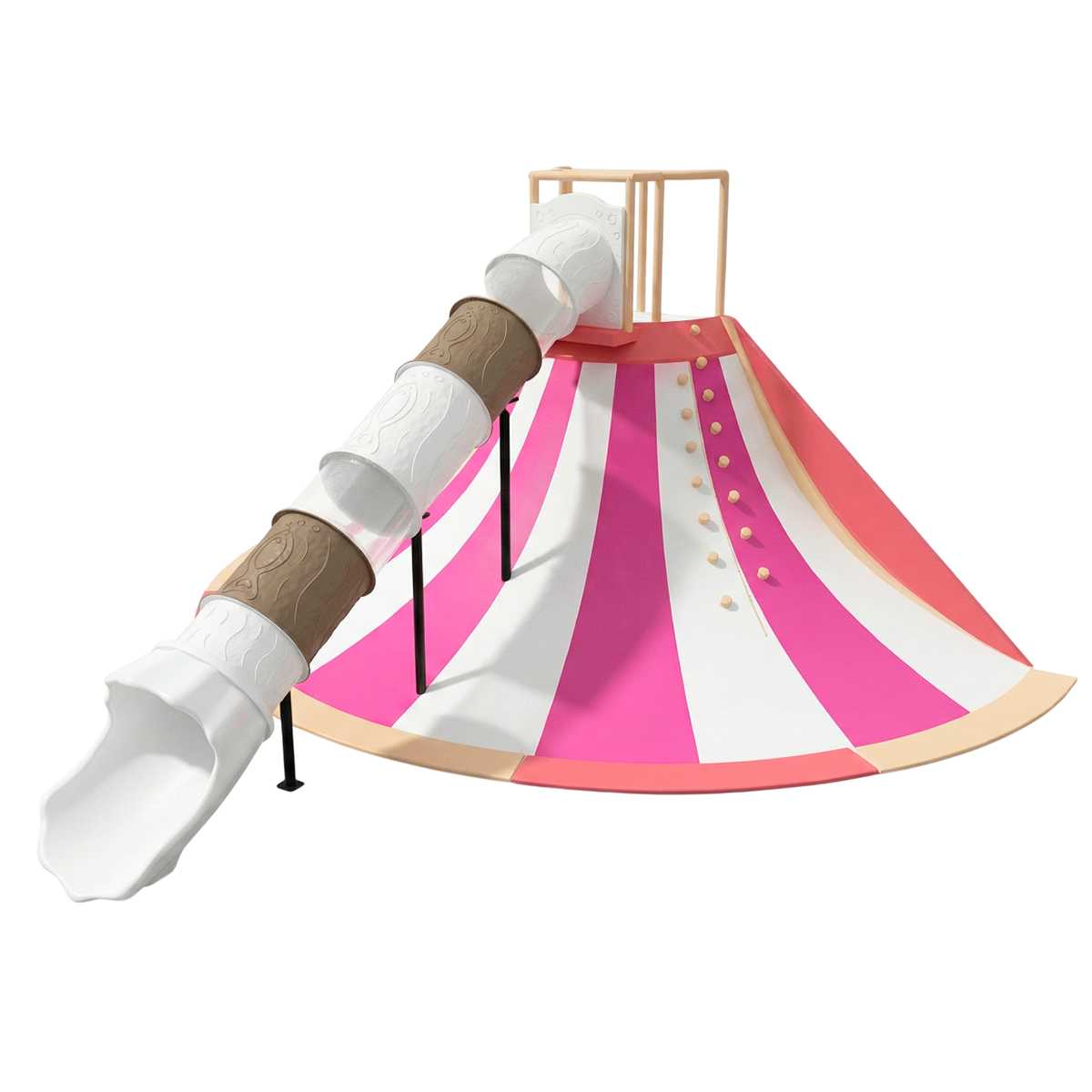 Горка-скалодром «Пик» изготовлен в ярких и жизнерадостных цветах, таких как розовый и белый, что делает аттракцион заметным и привлекательным для детей. Элементы дизайна включают трубообразную горку, которая обеспечивает динамичный спуск, а также зацепы для лазанья, что позволяет детям развивать физическую активность.