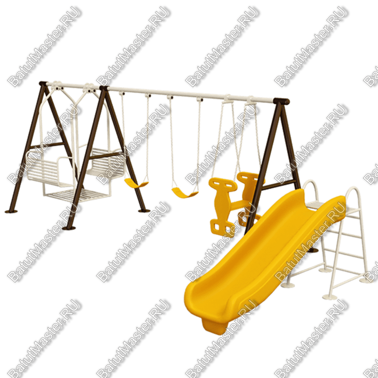 Широкая детская горка жёлтого цвета и три вида качелей.