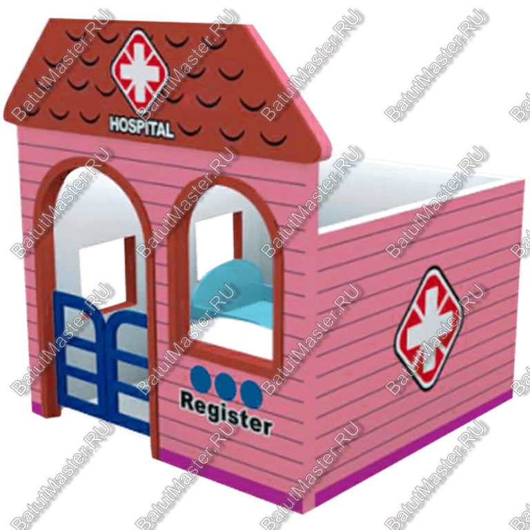 Конструкция достаточно легкая, что позволяет устанавливать ее в необходимом для игры месте. Соединительные элементы скрыты и защищены от возможного контакта с детьми. Двери и окна домика выполнены в простом, но оригинальном стиле. Передняя стена выполнена с окошком регистратуры и это создает эффект реальности. Конструкция украшена тематическими крестами и другими эмблемами медицинской помощи.
