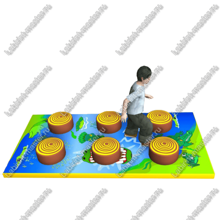 Игровой элемент представляет собой небольшую платформу, где прорисованы крокодилы, лягушки и водное пространство. Но ключевой деталью являются пеньки, по которым дети должны прыгать, чтобы не оказаться в пасти злого крокодила. Игра простая, но интересная. Ребята смогут заинтересоваться ею. А разыгравшийся азарт не позволит им просто взять и уйти после первого прохождения по всем пенькам.