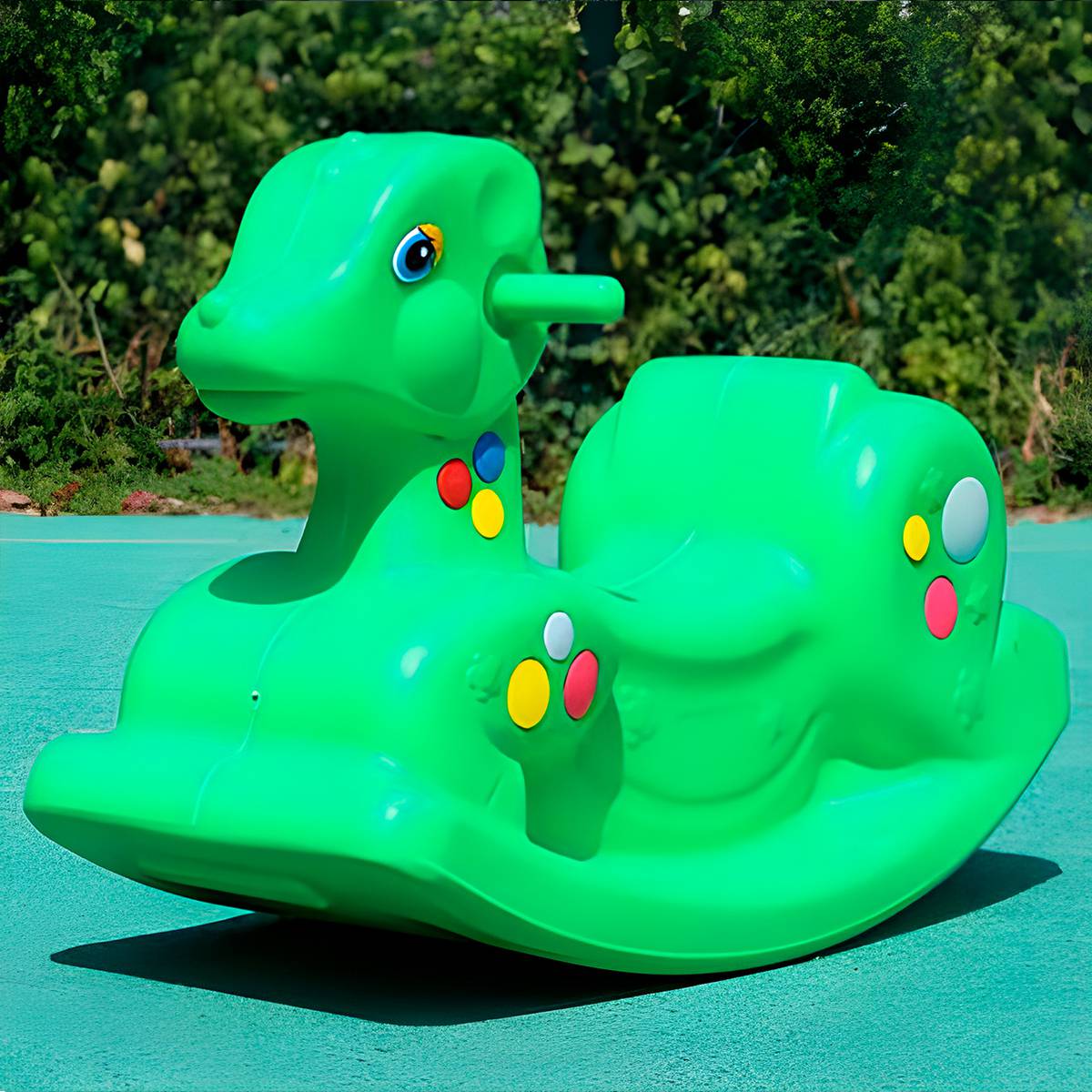 Основание оборудования является подножкой, а поручни для рук смонтированы в голове оленёнка. Одноместная качалка, которая имеет небольшой вес, легко раскачивается даже усилиями одного малыша. Удобная платформа основания позволяет малышу самостоятельно садиться на коня и так же без посторонней помощи с него сходить.