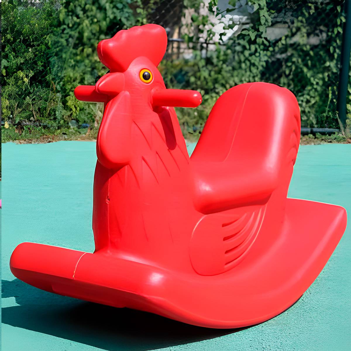 Одноместная качалка для помещений сконструирована в виде милого и игривого петушка, который ждет ребенка, чтобы покатать его на себе. Фигура из пластика установлена на такой же пластиковой основе, которая изогнута для возможности раскачаться. На спине петушок имеет удобное сидение в форме кресла.