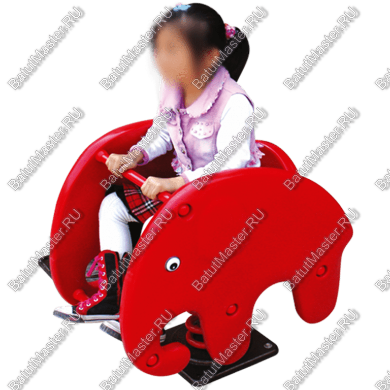 Представление самого слона выглядит достаточно забавно: фигура ярко красного цвета с опущенным вниз хоботом. В нижней части качалки проходит еще один поручень, но он уже предназначен для удобной фиксации ног, поэтому выполняет функцию подножки. Опираясь на эту подножку и держась за верхний поручень, дети раскачиваются.