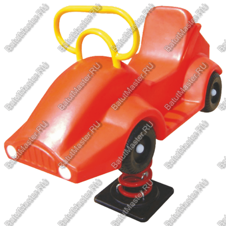 Пружина установлена на железную квадратную пластину с отверстиями по углам, при помощи которых весь аттракцион надежно прикрепляется к полу. Вид спереди преподносит качалку не как обычный автомобиль, а скорей всего, как гоночный. Именно поэтому данная модель интересна детям и в то же время абсолютно безопасна для их здоровья.