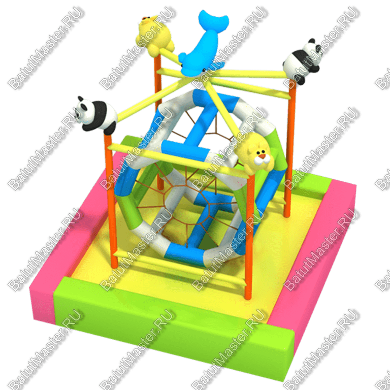 «Крутящееся колесо» в обиходе часто называют просто – беличье колесо. Это сразу дает четкое представление о предлагаемом игровом оборудовании. Колесо выполнено на платформе, на которой установлено 4 опорные стойки. Стойки украшены фигурками животных, хорошо известных детям из мультфильмов и сказок: панда, дельфина и прочие. Вращение колесу передается от электродвигателя с напряжением питания 220 Вольт. Вся конструкция платформы выполнена их металлопластика, покрытого поливинилхлоридной пленкой (ПВХ) в разных ярких цветах. Размеры оборудования составляют 2100 мм на 2100 мм и на 2000 мм. Такие габариты основания подтверждает устойчивость аттракциона и его безопасность.