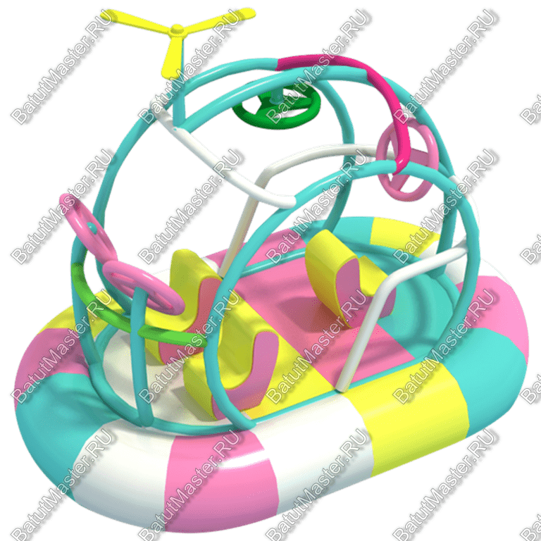 Представленное игровое оборудование ассоциируется с общими чертами вертолета на надувной подушке для посадки на воду. На платформе установлено 3 сидения и 4 руля управления, и даже есть пропеллер. Четвертый руль управления расположен прямо над головами играющих детей под установленным выше каркаса пропеллером. Сидения ограничиваются поручнями, что обеспечивает определенную безопасность детей. Конструкция изготовлена из материалов, которые по своим характеристикам разрешены для использования детьми.