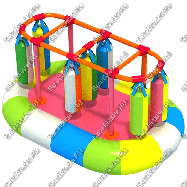 Основой конструкции является металлопластиковый каркас. Каркас установлен на платформе в виде надувной лодки. Работает оборудование от электродвигателя на напряжение 220 Вольт. Габаритные размеры составляют 2900 мм на 1800 мм на 2000 мм. Площадь основания платформы обеспечивает абсолютную устойчивость и надежность игрового оборудования. По периметру верхнего каркаса закреплены разноцветные мешки, которые имитируют песочные мешки. Диаметр металлопластиковых труб рассчитан на участие в играх детей дошкольного возраста и младшего школьного.