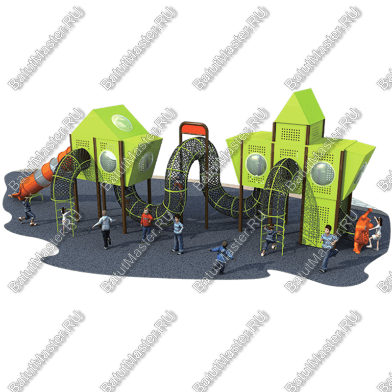 Этот игровой комплекс необычайно интересный и занимательный. Он абсолютно безопасен, ведь в конструкции проработана каждая мелочь. Такая площадка не только интересна своими возможностями для физического развития, но и вдохновляет на сюжетные игры. Материал: Оцинкованные трубы; пластик, получаемый методом ротационного формования; трос в оплетке: Ø 12 мм