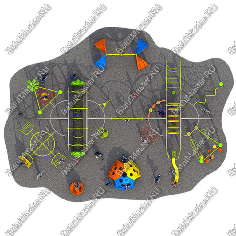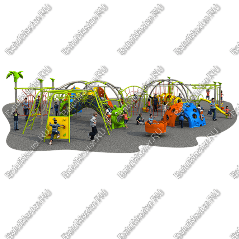 Игровой комплекс станет отличным украшением любого двора или парка. Большая, яркая, интересная площадка не только привлечет к себе внимание ребятишек, но и позволит одновременно играть довольно многочисленной компанией. Множество игровых элементов стимулируют физическое развитие, воображение, а также вдохновляют на сюжетные игры. Материал: Оцинкованные трубы; пластик, получаемый методом ротационного формования; трос в оплетке: Ø 12 мм; канат: Ø 16 мм