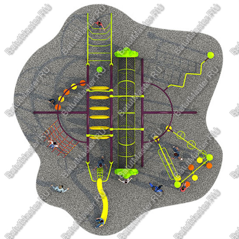 Данный игровой комплекс – очень интересный. Он притягивает к себе детвору, благодаря интересным игровым элементам. Вы удивитесь тому, как на относительно небольшой площади могут играть одновременно столько ребятишек. Установив такую конструкцию в своем дворе или на даче или в парке, вы сможете насладиться радостью и весельем своих малышей. Материал: Оцинкованные трубы; пластик, получаемый методом ротационного формования; трос в оплетке: Ø 12 мм; канат: Ø 16 мм