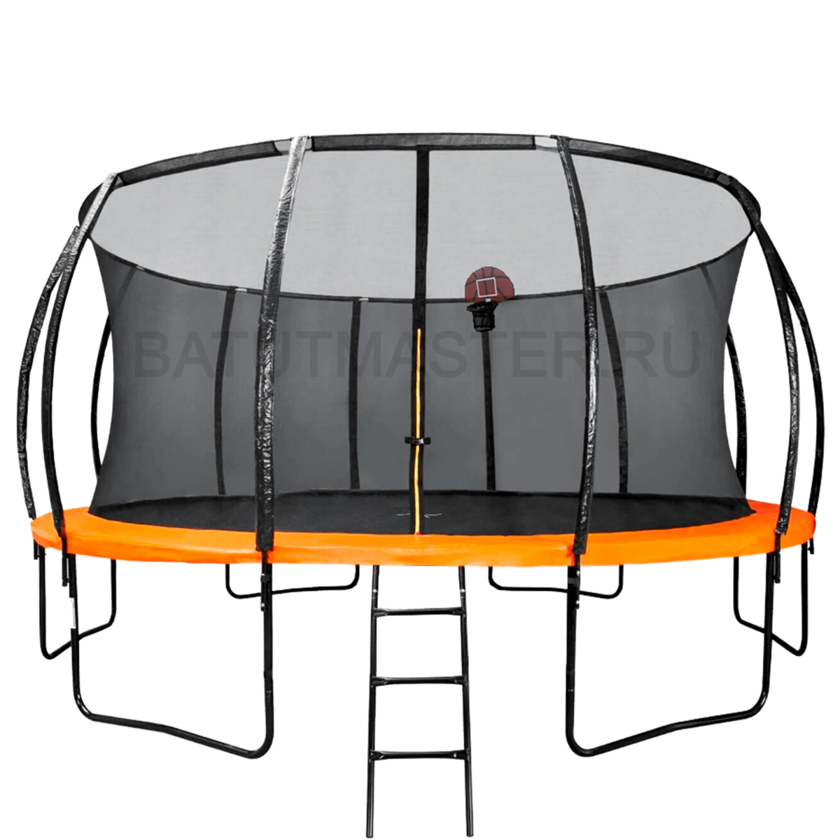 Каркасный батут с баскетбольным кольцом и лестницей оснащен толстыми металлическими ножками, в которые предусмотрена вторая фиксация. Они устойчиво стоят на земле и не дадут изделию опрокинуться на бок. Все материалы, из которые состоит изделие безопасны, не выделяют токсинов и не впитывают грязь. Ухаживать за ними легко и просто.