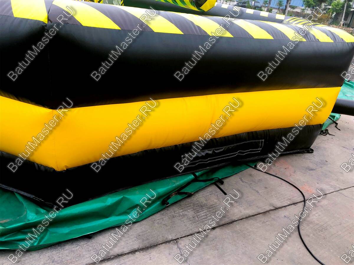 Увлекательная игра, представленная данным надувным батутом, напоминает восьмиугольный циферблат часов, по которому двигаются две стрелки. Но на самом деле это коммерческий аттракцион из ПВХ в виду надувной открытой площадки в желто-черной расцветке. По периметру надувного ограждения надувная игра оборудована несколькими проемами, через которые можно попадать внутрь аттракциона.