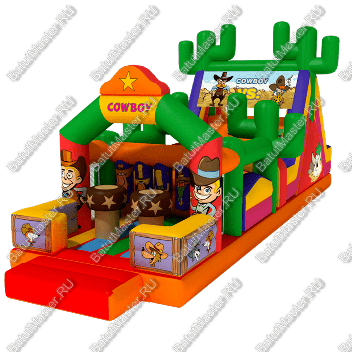 Комплекс украшен надувными кактусами, рисунками ковбоем и модулями в виде ковбойской атрибутики. Здесь каждая деталь призывает к веселью. Яркий современный комплекс предназначен для бизнеса. Не требует дополнительных вложений.