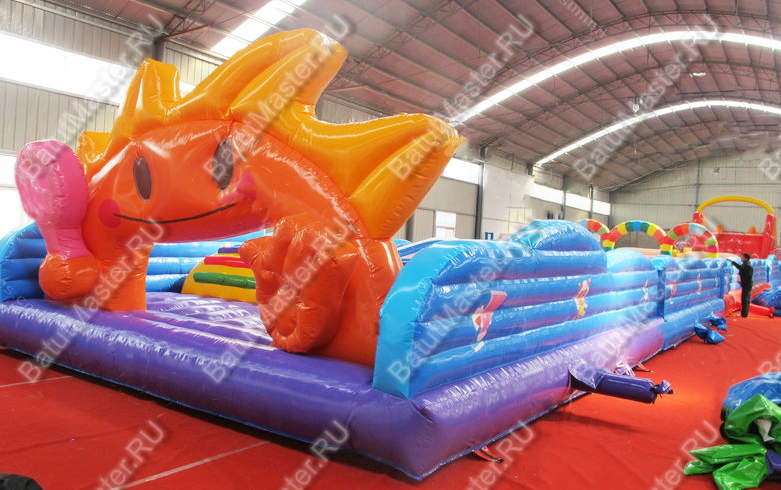 На финише красуется солнышко с огромной улыбкой. Каждый участник испытает невероятные ощущения после преодоления надувной полосы препятствий.