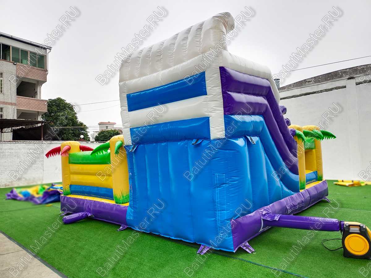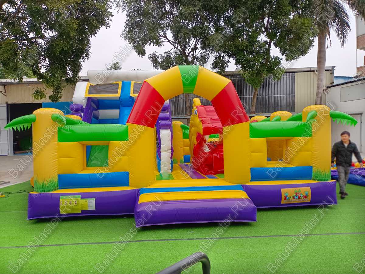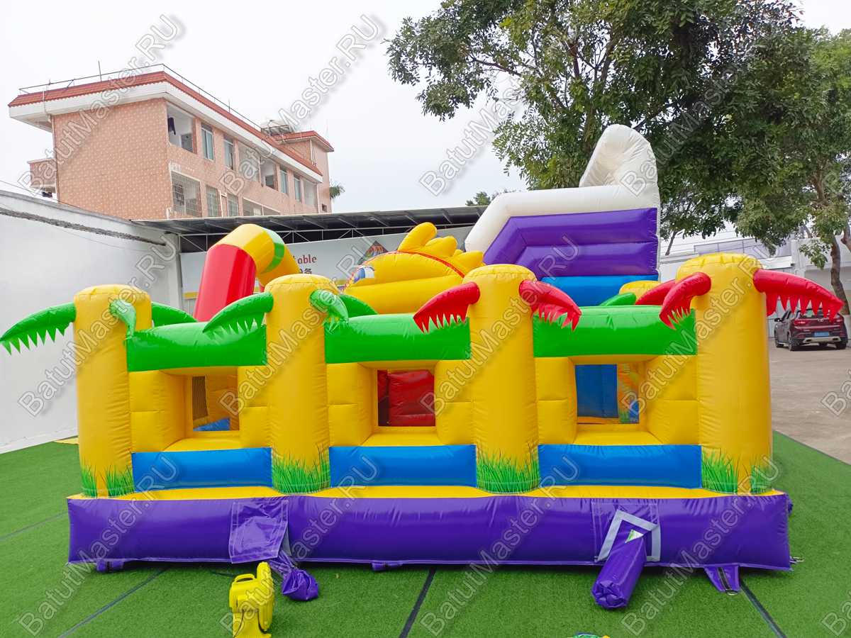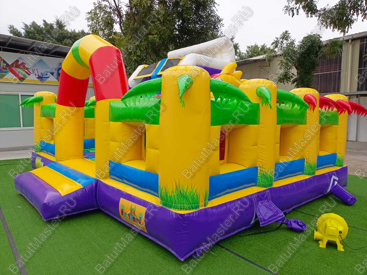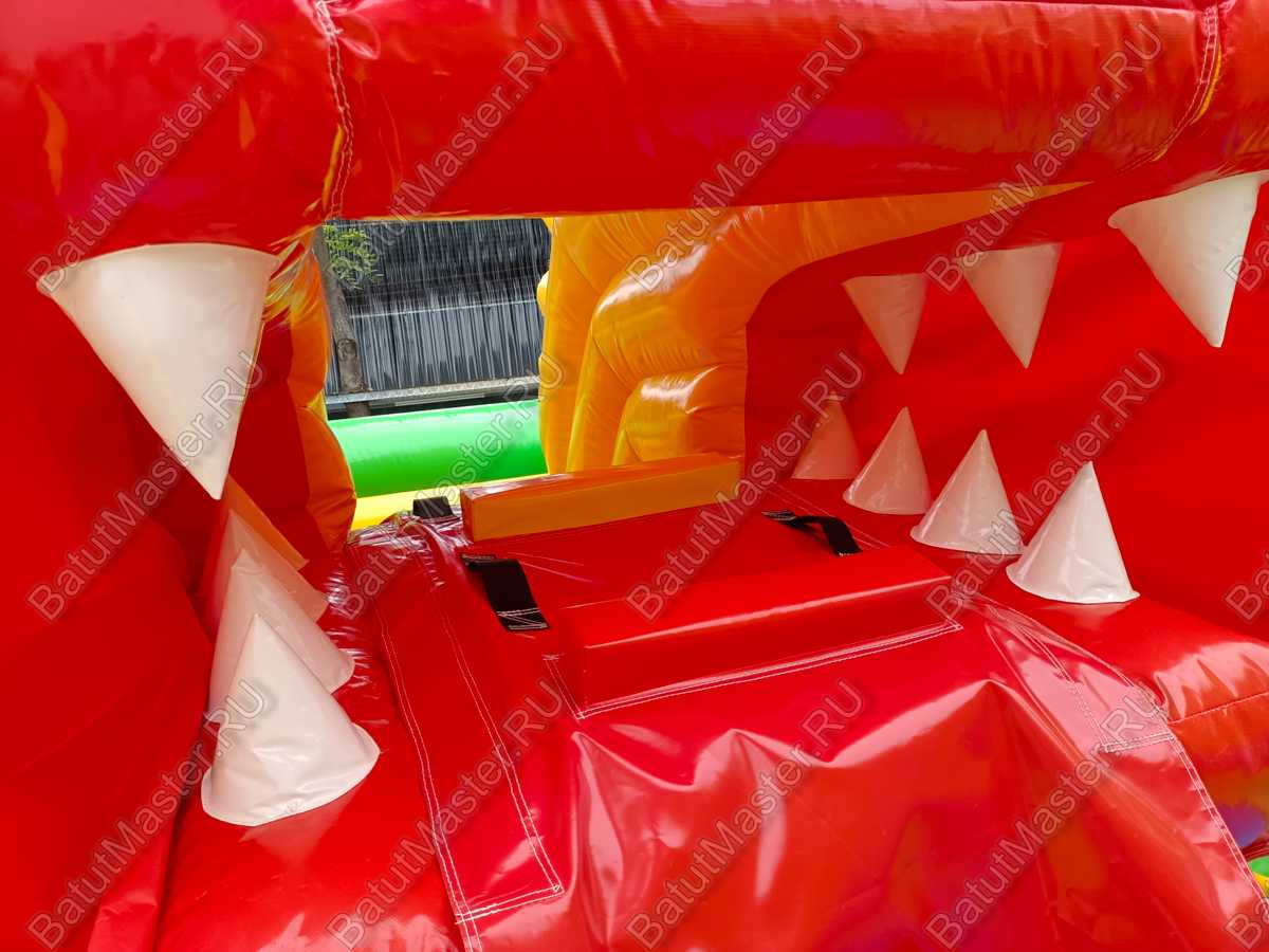 Для развлечения посетителей в конструкцию включены – скат высотой 170 см, механизированная голова, сухой бассейн, надувные формы для активных игр. Внутри комплекса есть свободный простор для бегания и прыгания.