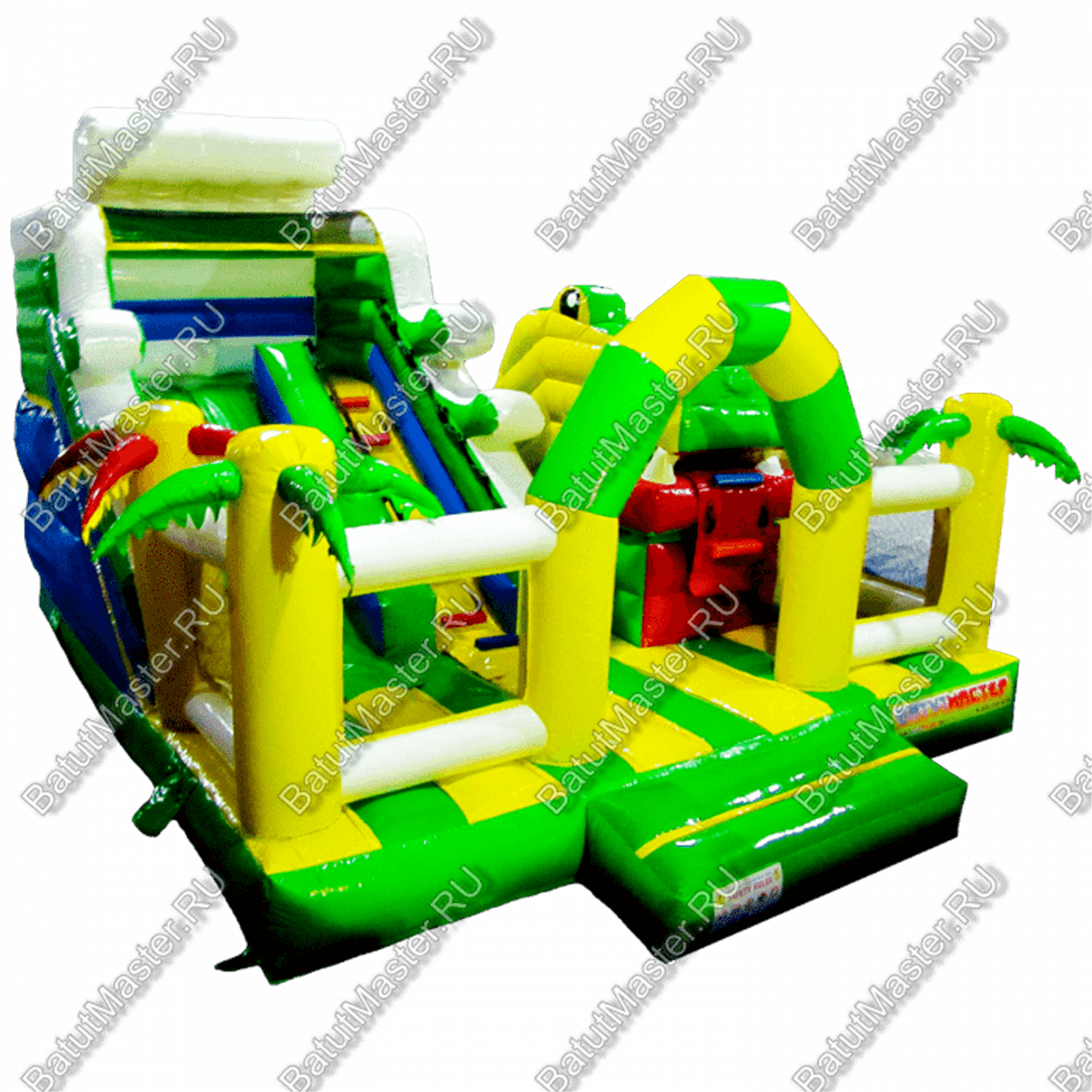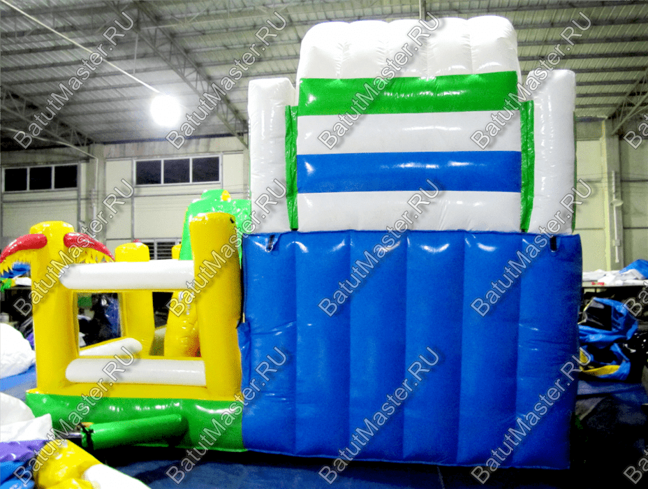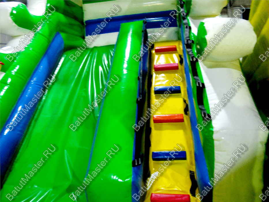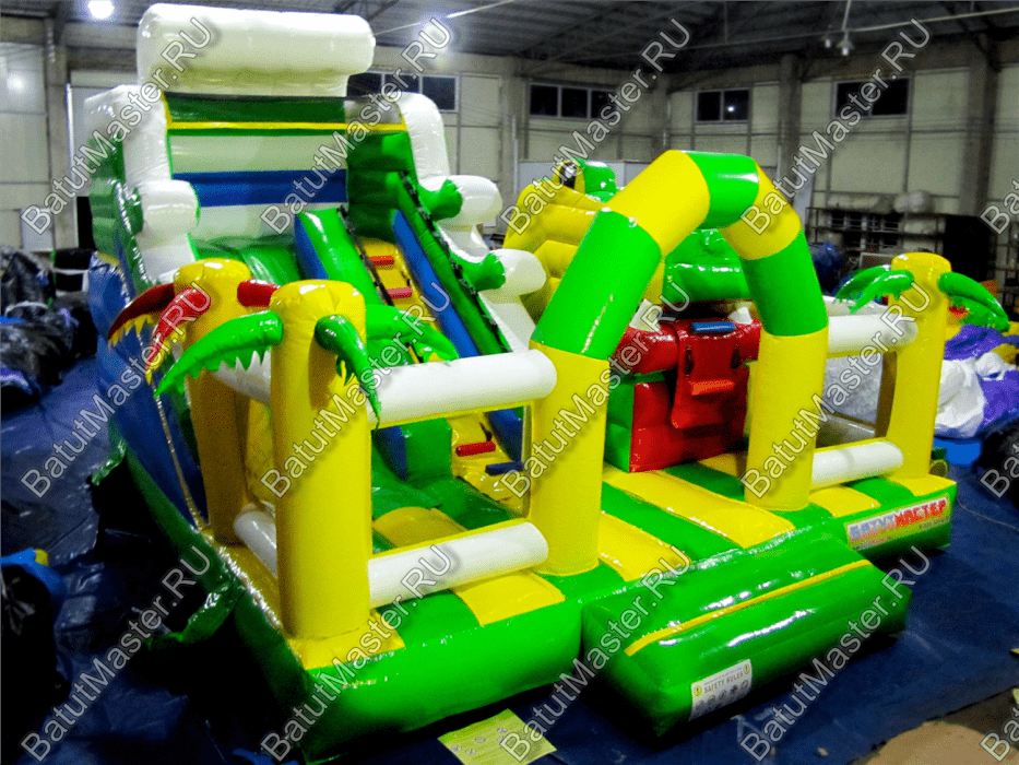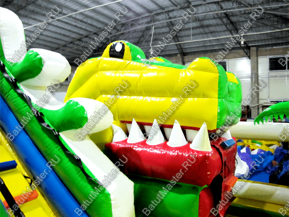 В правой части коммерческого батута установлена робот-пасть и снова в виде головы зеленого крокодила, а его язык – это не что иное, как ярко красная лестница, по которой дети могут залазить в пасть хищника.