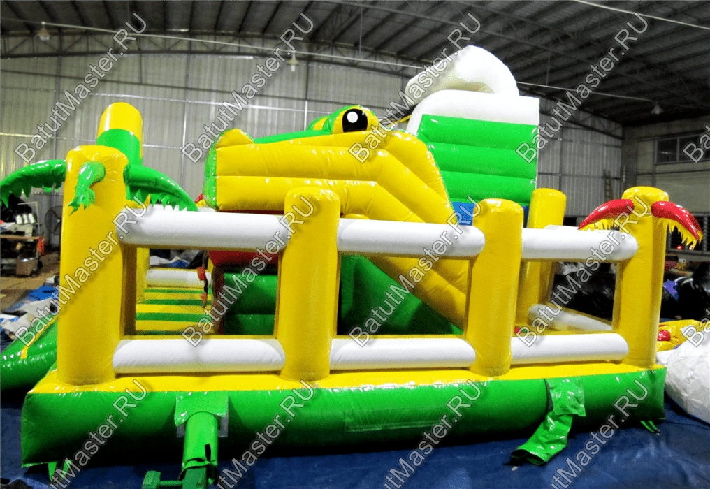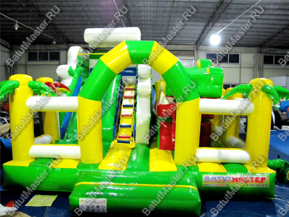 Спускаясь с горки, дети приземляться на просторное прыжковое поле. Здесь можно отталкиваться от надувных стенок, подлетать вверх, кувыркаться. А чтобы забраться наверх, им необходимо будет преодолеть мягкие удобные ступеньки, по которым следует двигаться на четвереньках, и при этом приложить немало усилий.