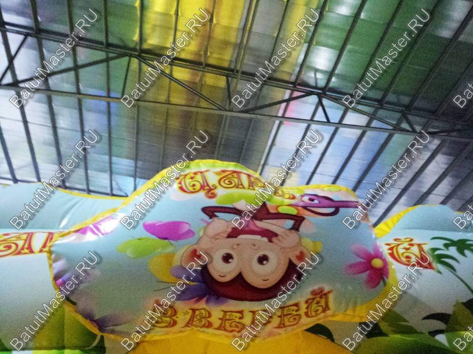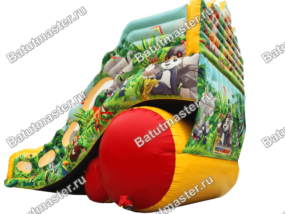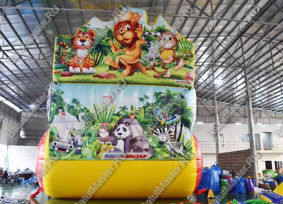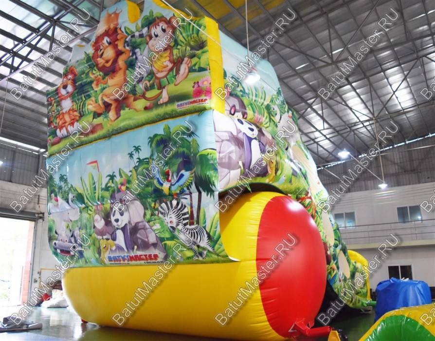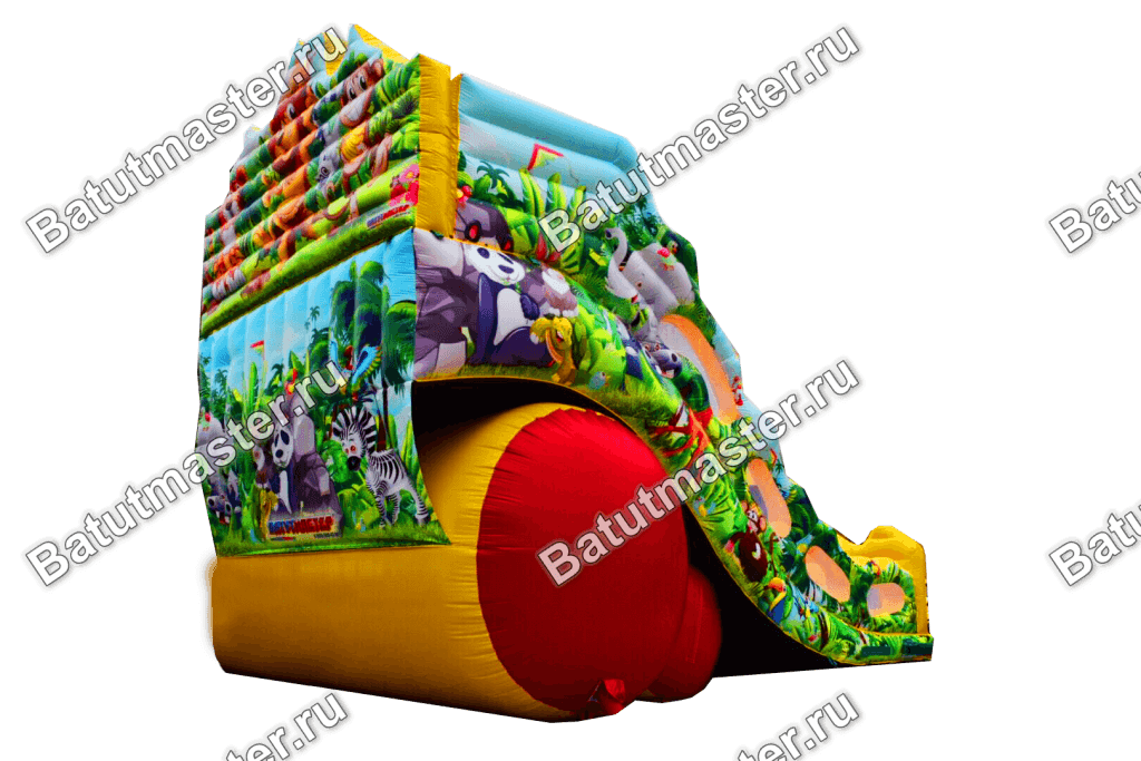 Коммерческий батут, изображающий огромное количество африканских животных – лучшая площадка для детских забав и игр. Животные всегда для детей остаются самыми любимыми существами, особенно, если они из дальних джунглей. Именно такими изображениями растительного и животного мира украшены все стены батута-горки с внешней и внутренней стороны. Львы, тигры, обезьяны, панды, черепахи – их просто так не встретишь на улице, поэтому единственный шанс с ними познакомиться отправиться на надувную площадку, сшитую из яркого и безопасного ПВХ.