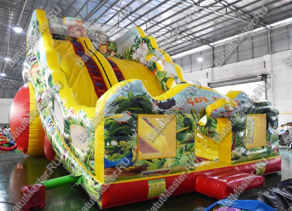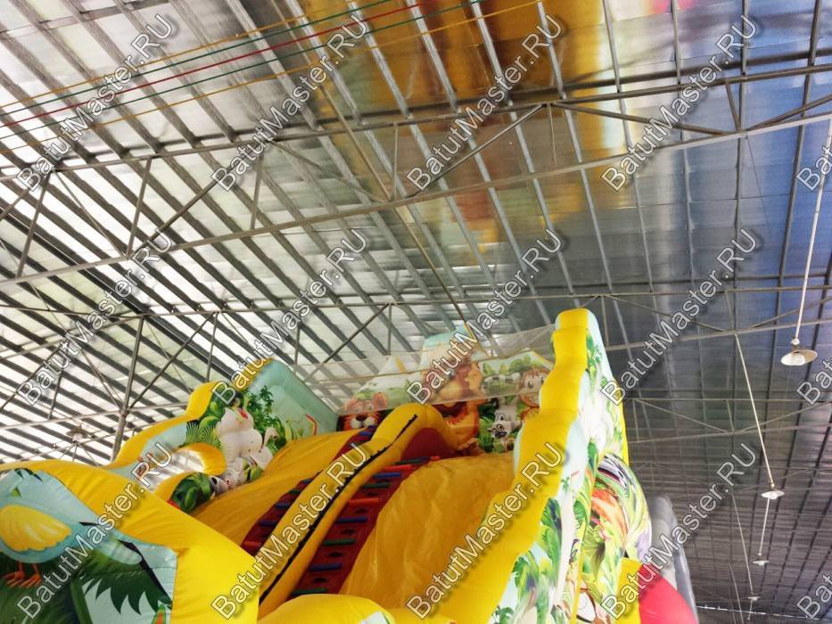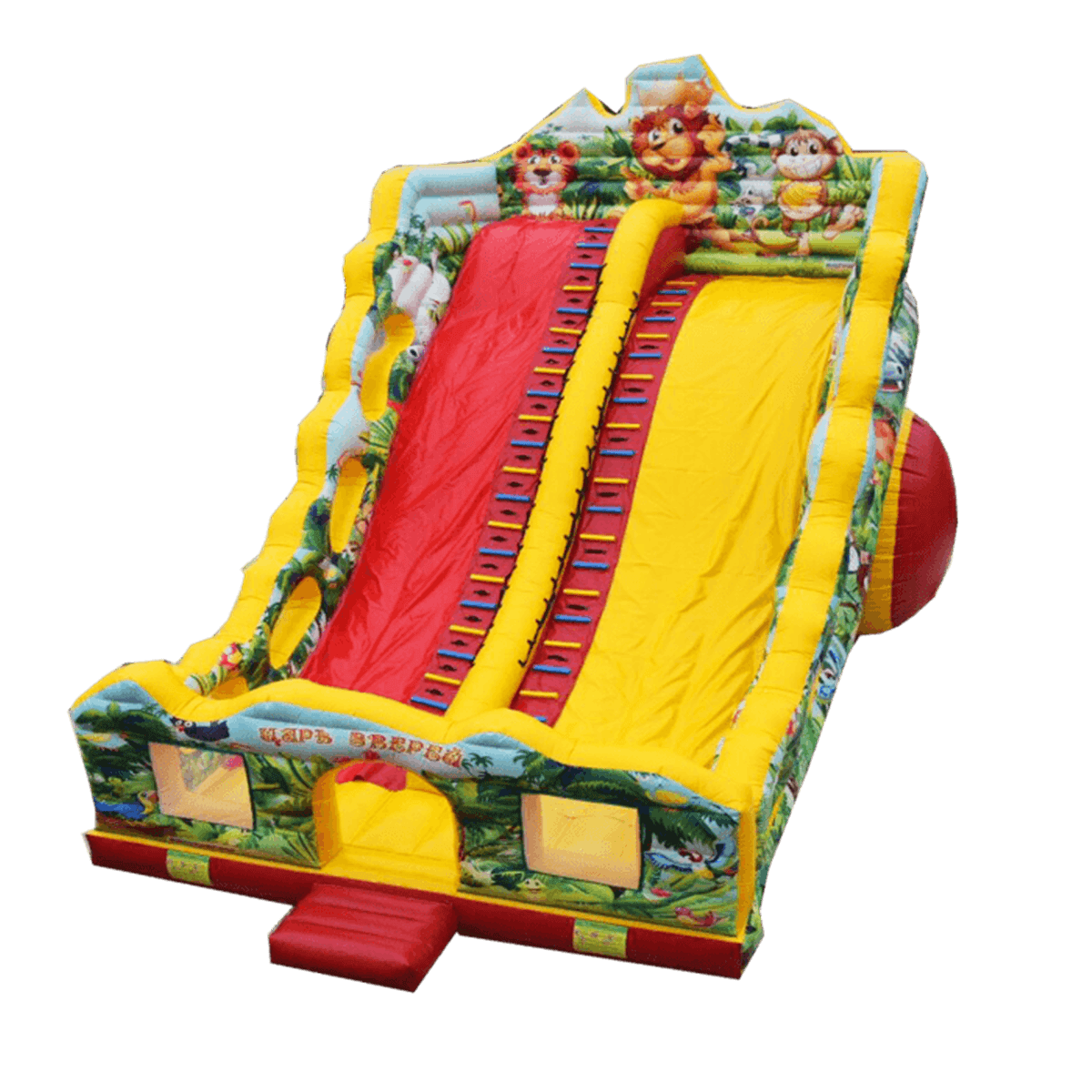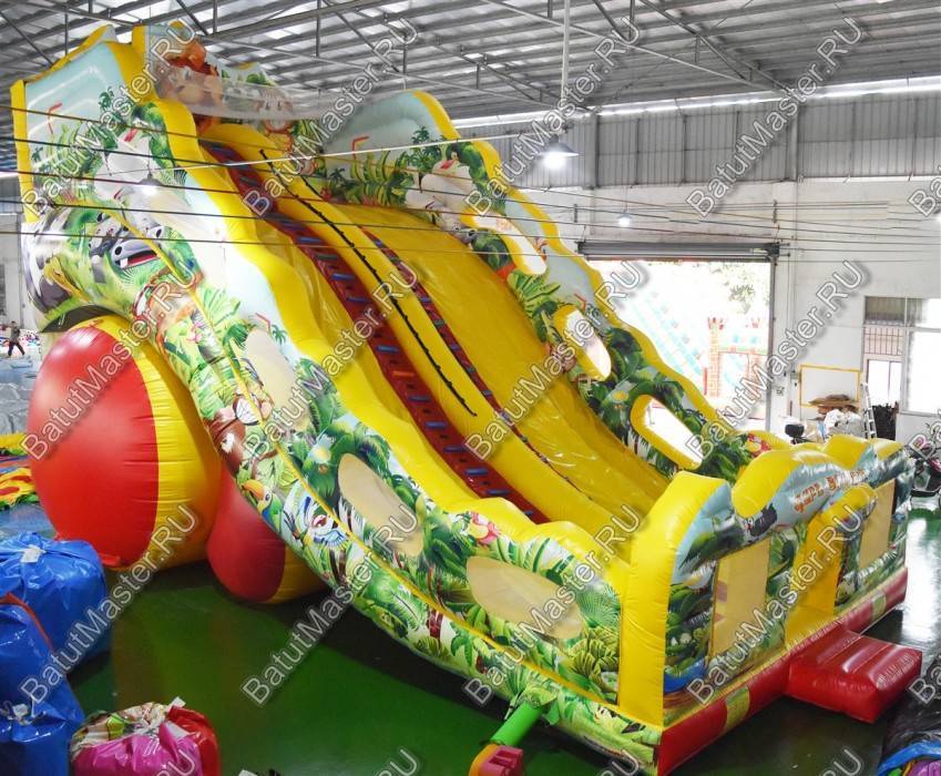 Коммерческий батут, изображающий огромное количество африканских животных – лучшая площадка для детских забав и игр. Животные всегда для детей остаются самыми любимыми существами, особенно, если они из дальних джунглей. Именно такими изображениями растительного и животного мира украшены все стены батута-горки с внешней и внутренней стороны. Львы, тигры, обезьяны, панды, черепахи – их просто так не встретишь на улице, поэтому единственный шанс с ними познакомиться отправиться на надувную площадку, сшитую из яркого и безопасного ПВХ.