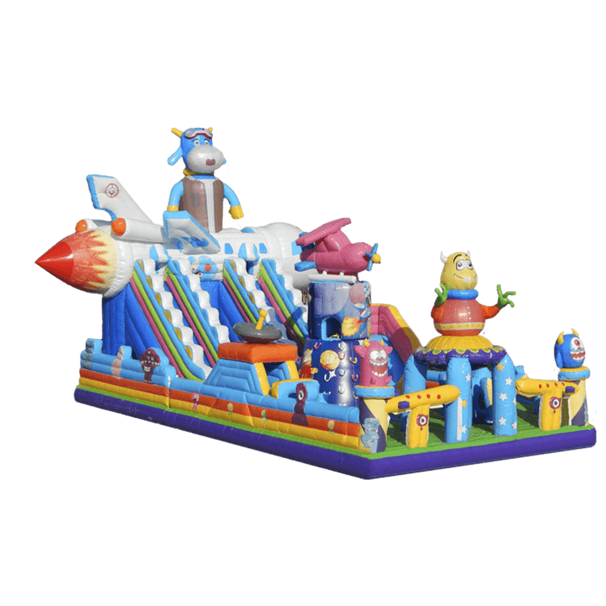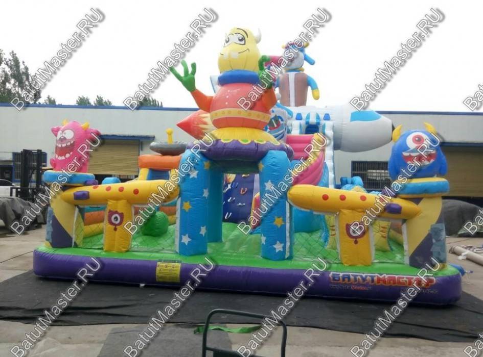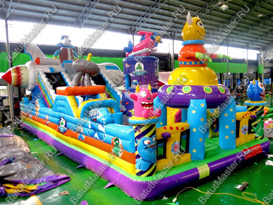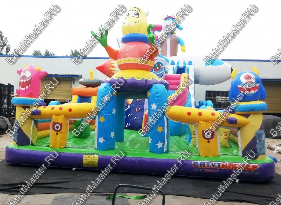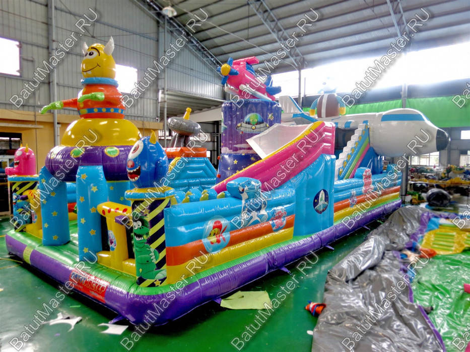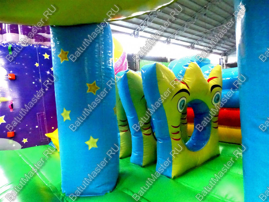 Коммерческий надувной батут для бизнеса оснащен несколькими горками, скалодромом и многочисленными веселыми космическими зверятами. Здесь все яркое и каждая деталь притягивает взгляд и обучает.